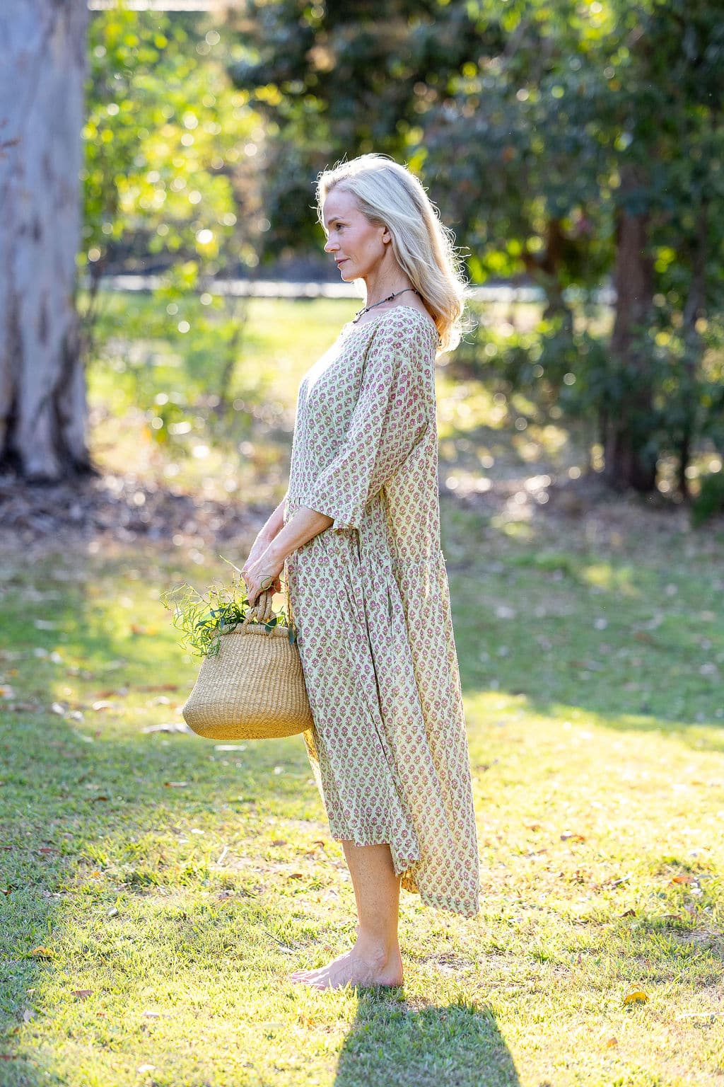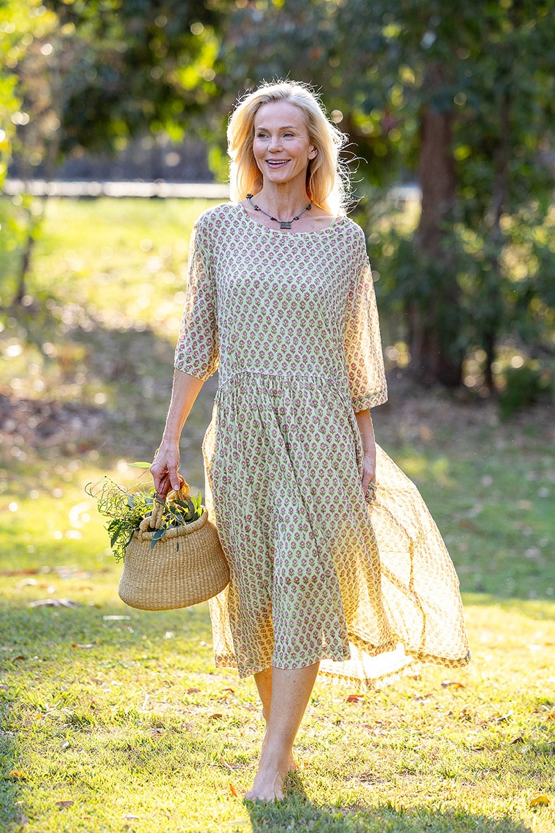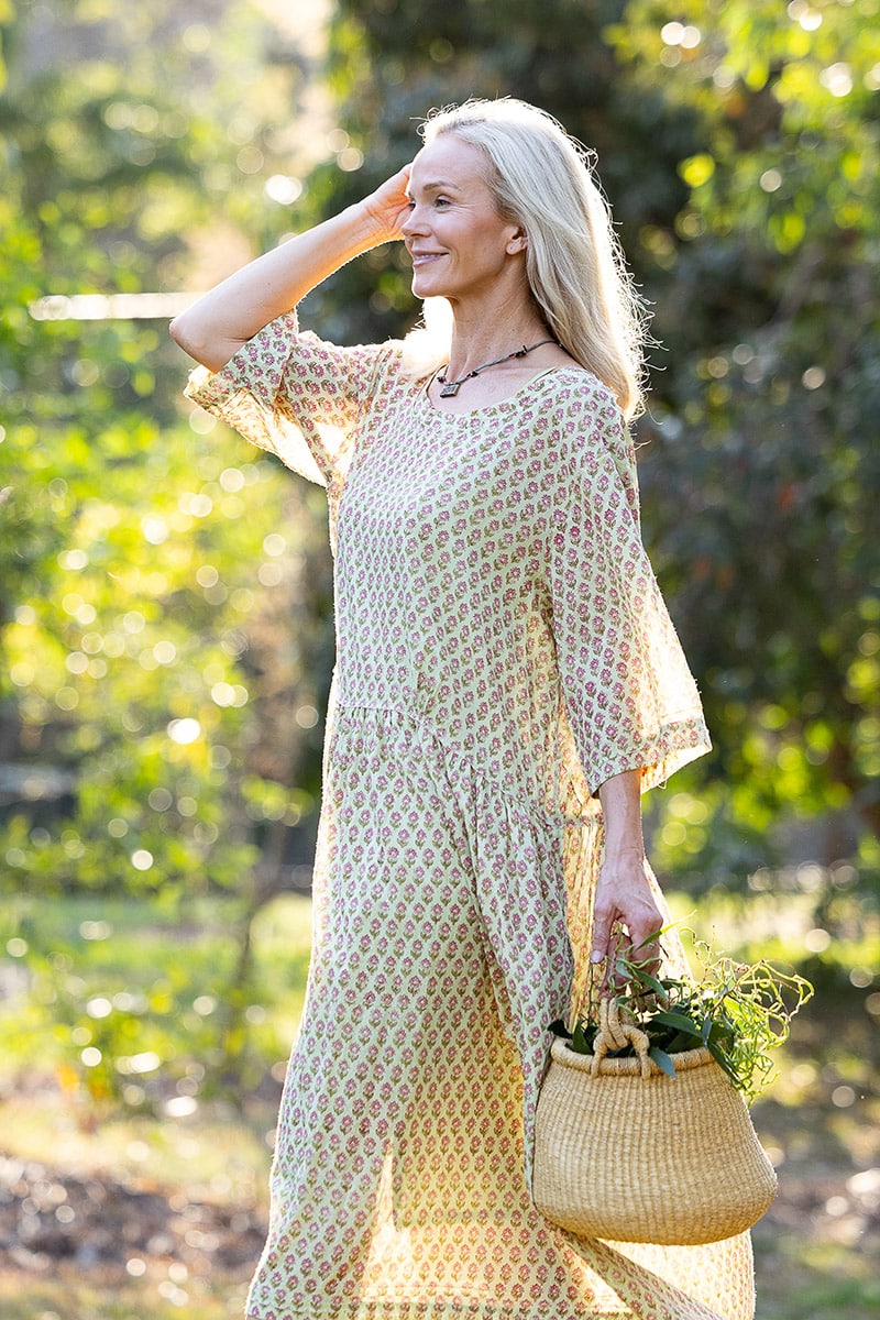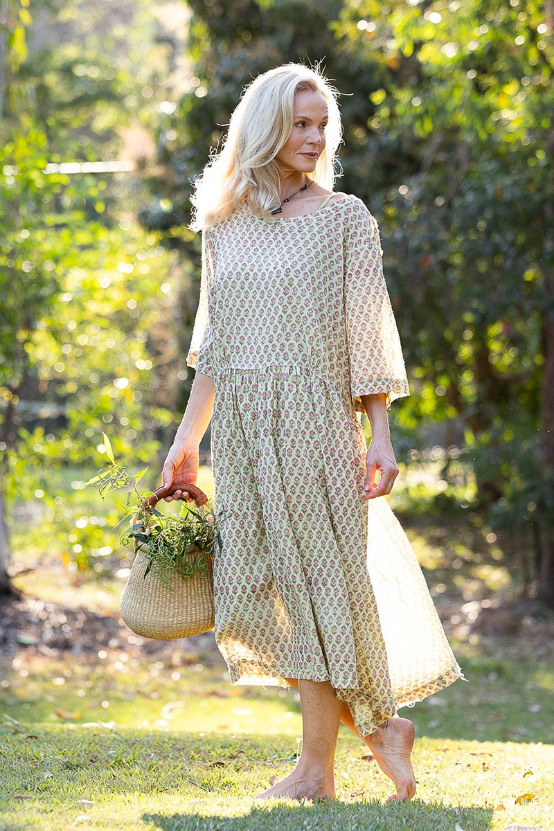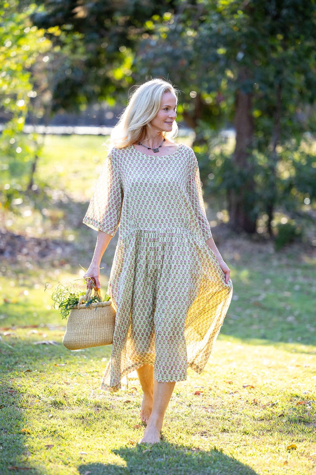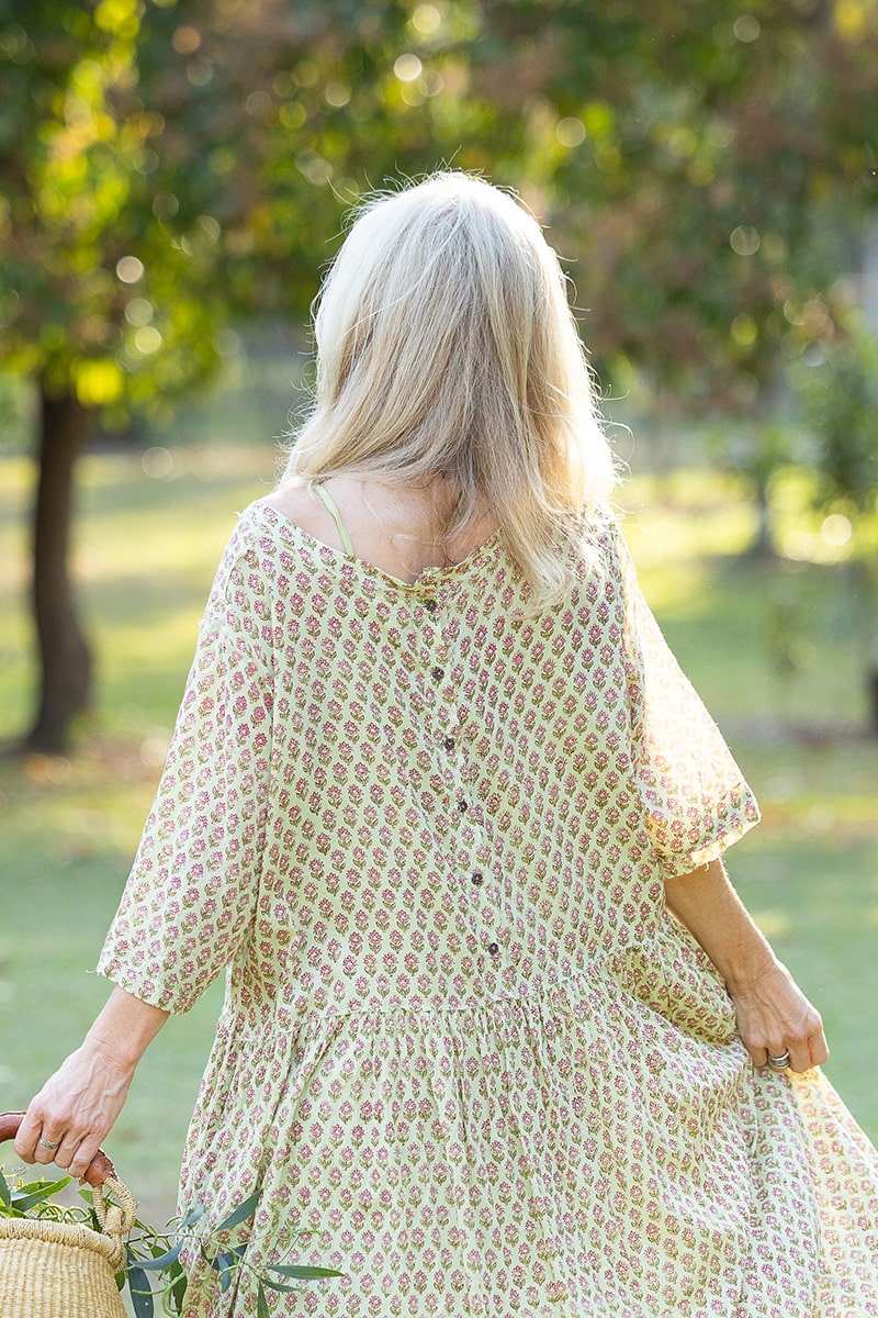 With a drop waist that gathers and falls into a flowing skirt, she moves with quiet freedom – a softness of spirit woven through every fold. Contrast-stitched metal buttons trail down the back (or front – sheโ€™s fully reversible), adding a hint of character to her thoughtful design.