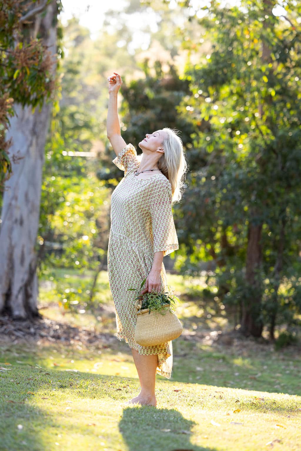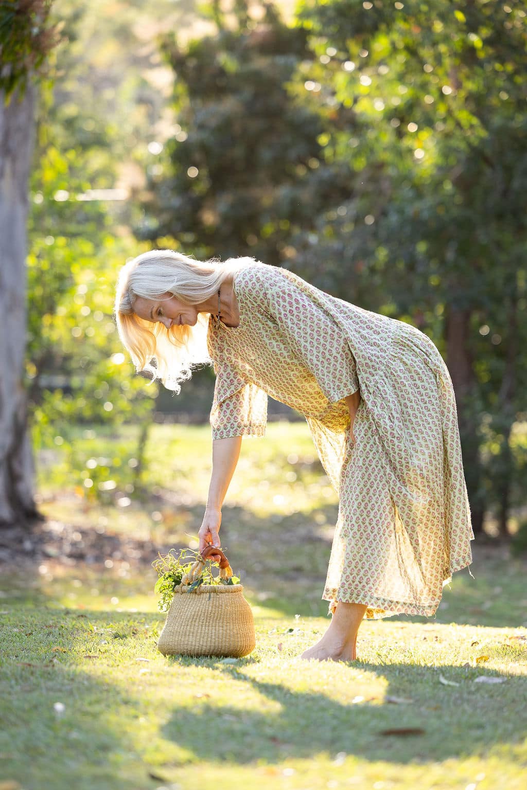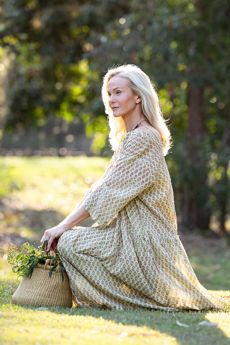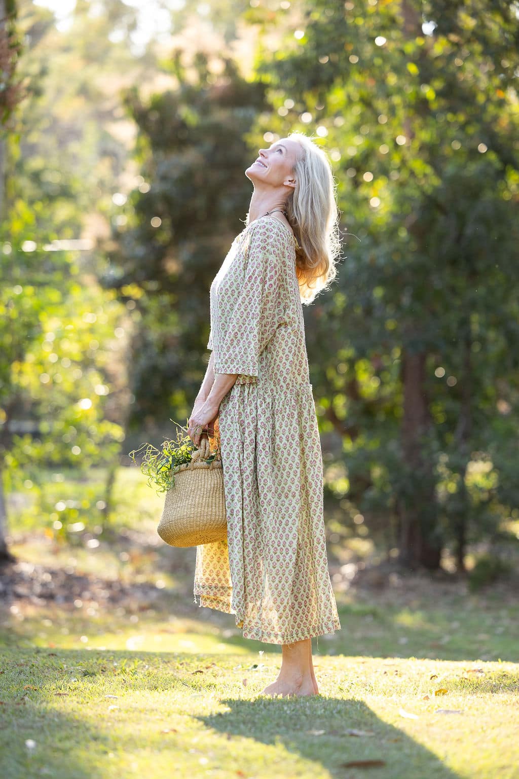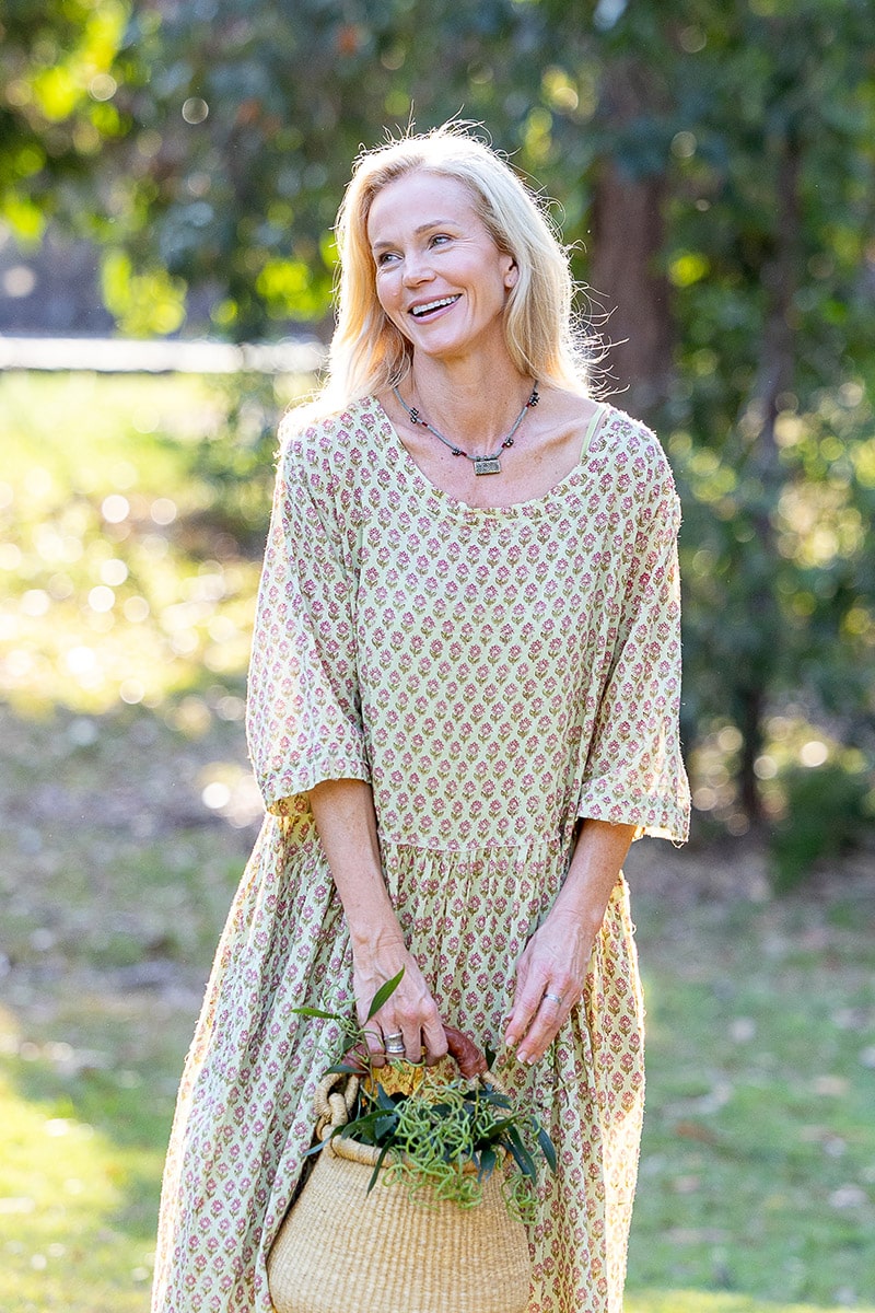 With a drop waist that gathers and falls into a flowing skirt, she moves with quiet freedom – a softness of spirit woven through every fold. Contrast-stitched metal buttons trail down the back (or front – sheโ€™s fully reversible), adding a hint of character to her thoughtful design.