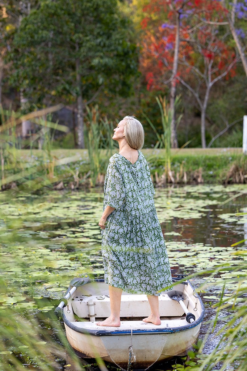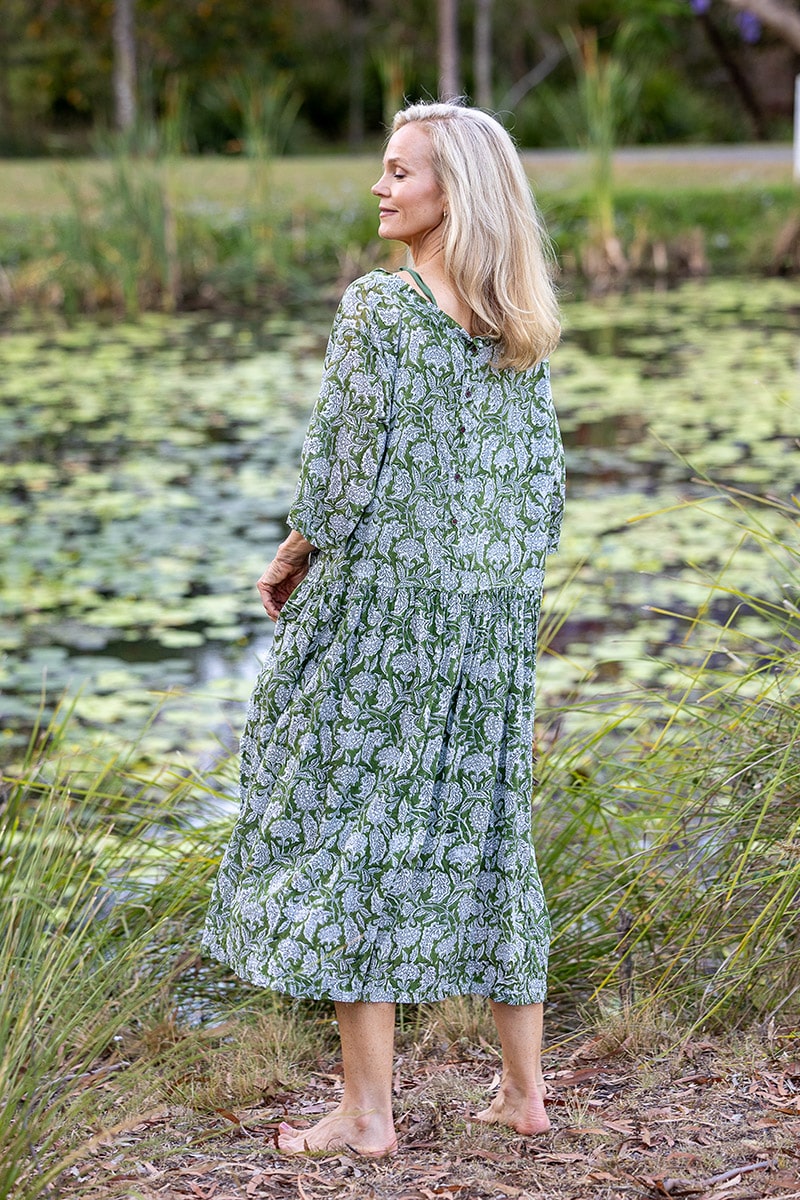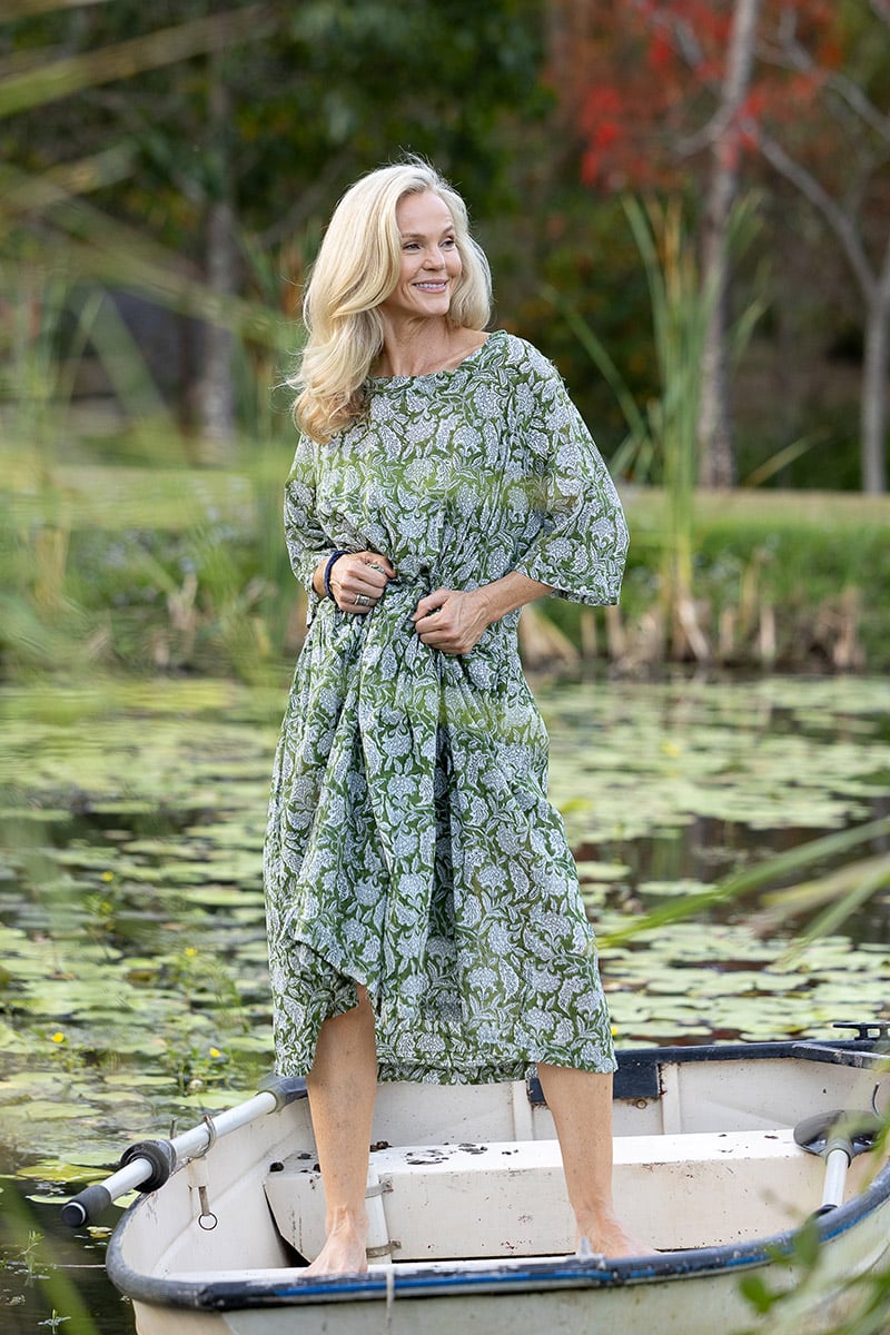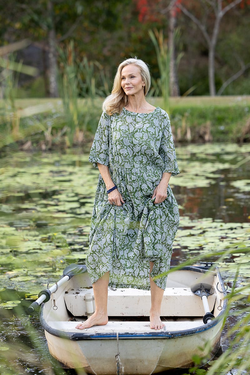 With a drop waist that gathers and falls into a flowing skirt, she moves with quiet freedom – a softness of spirit woven through every fold. Contrast-stitched metal buttons trail down the back (or front – sheโs fully reversible), adding a hint of character to her thoughtful design.