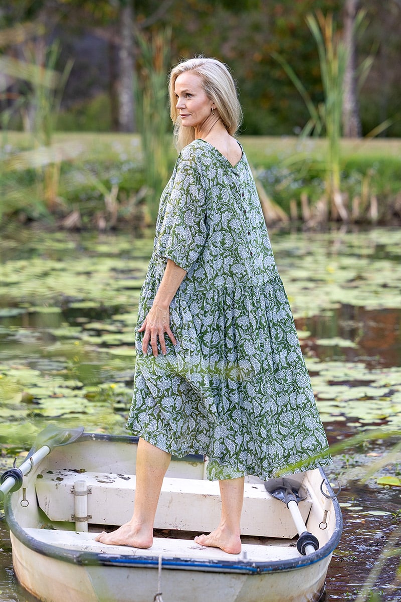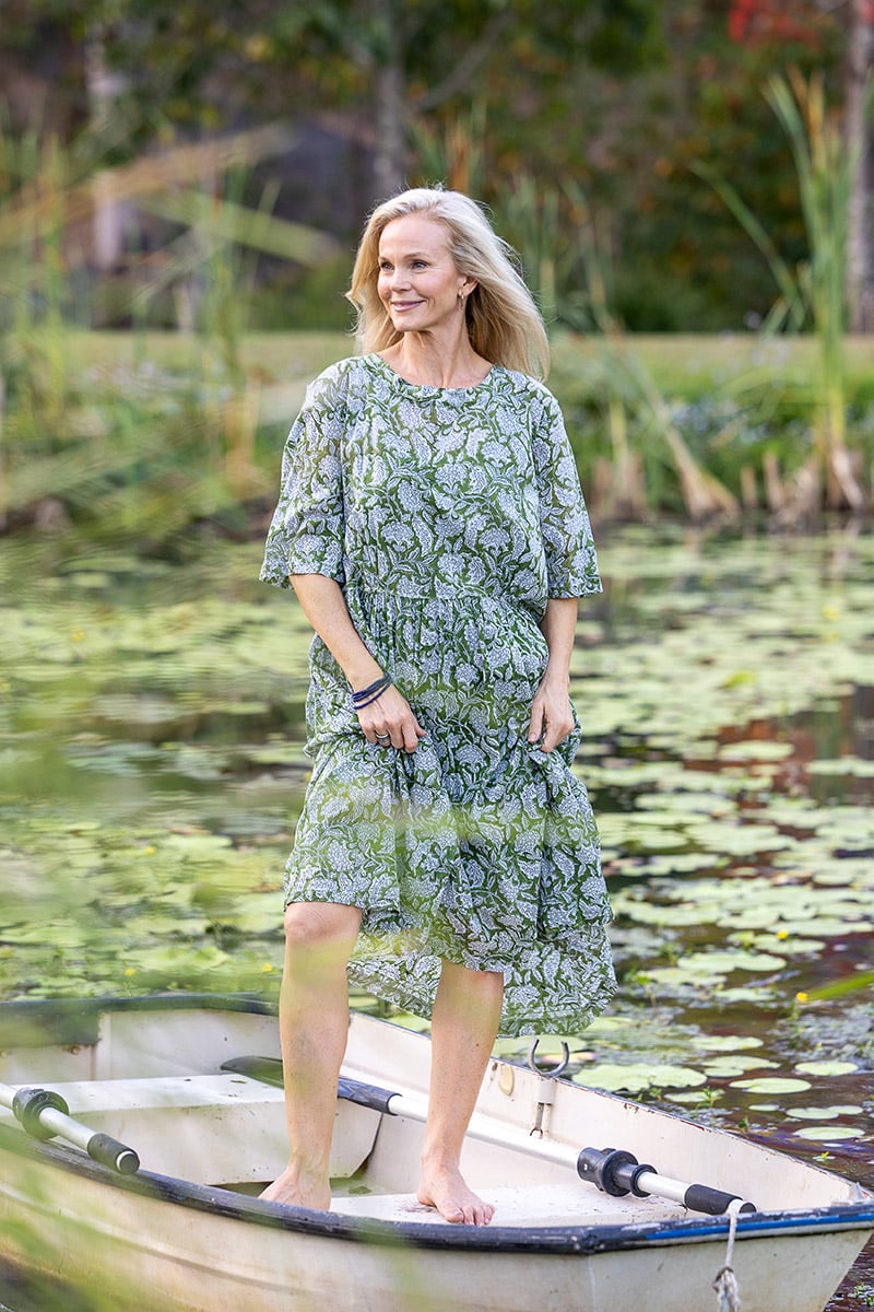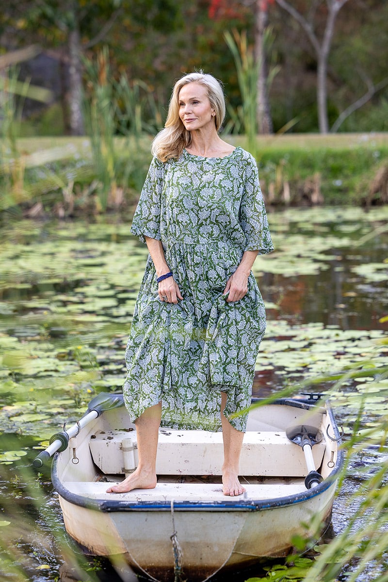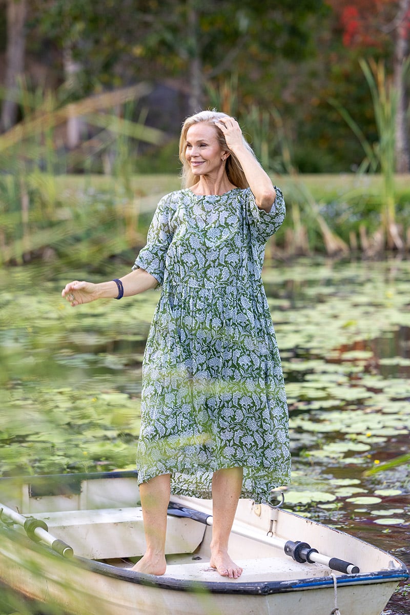 With a drop waist that gathers and falls into a flowing skirt, she moves with quiet freedom – a softness of spirit woven through every fold. Contrast-stitched metal buttons trail down the back (or front – sheโs fully reversible), adding a hint of character to her thoughtful design.