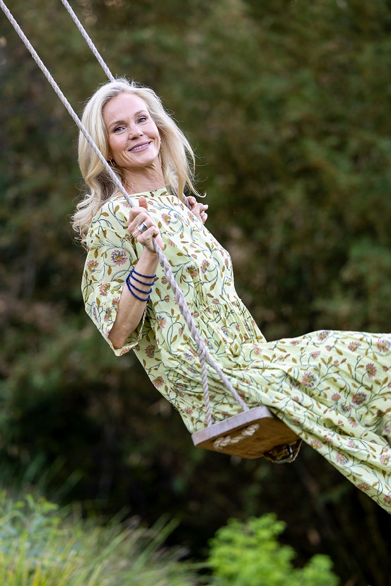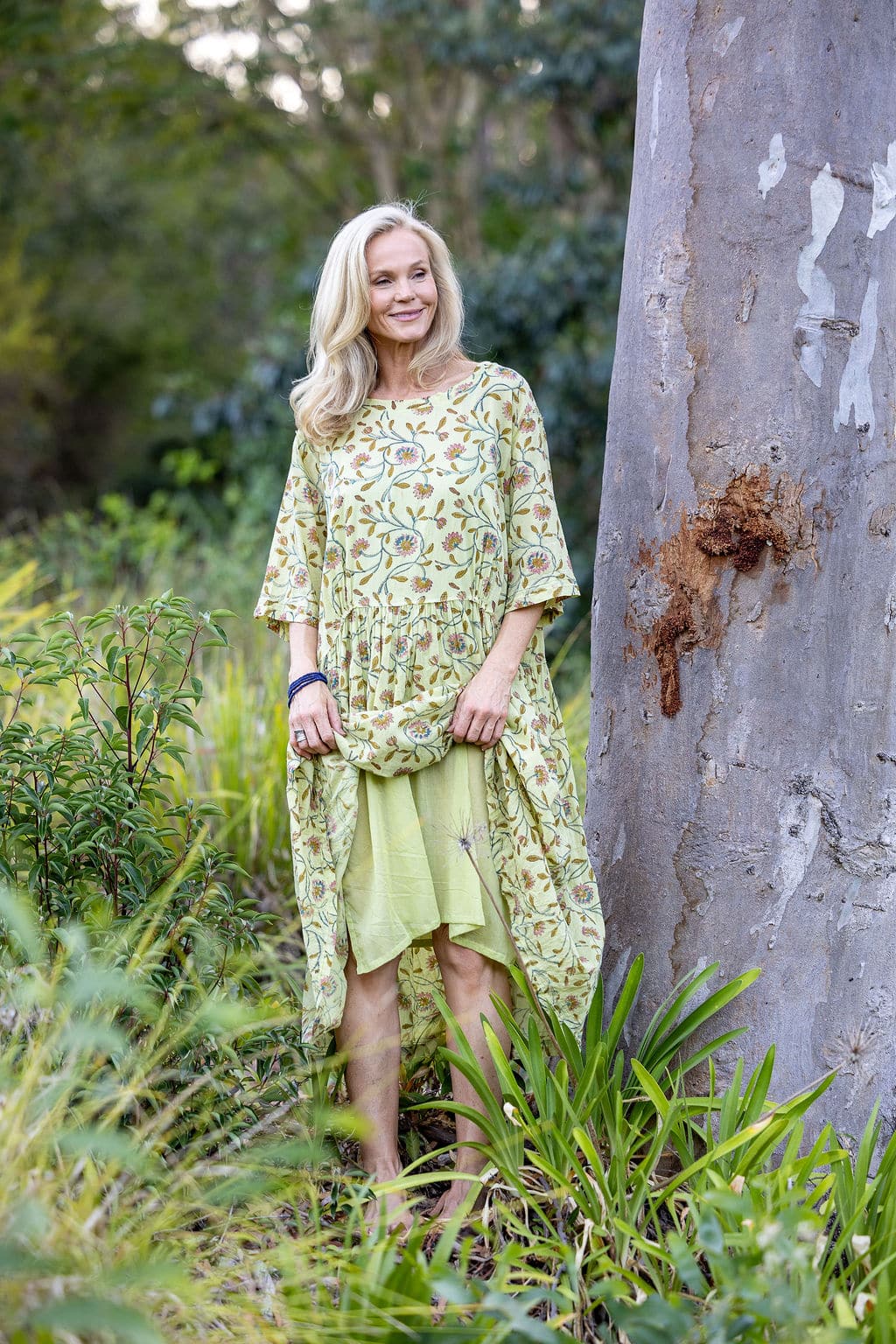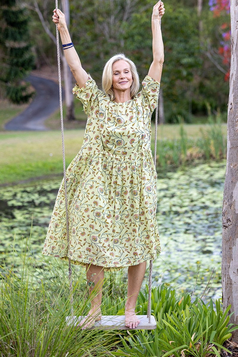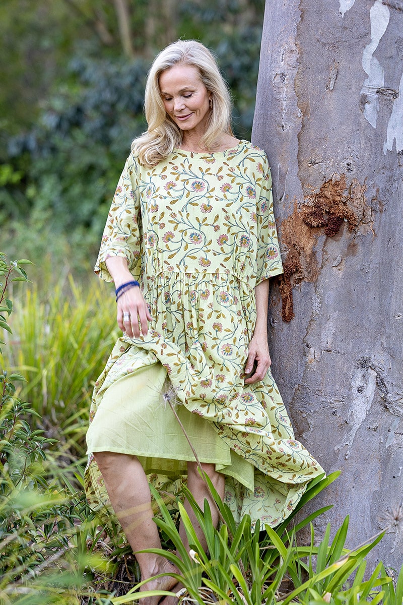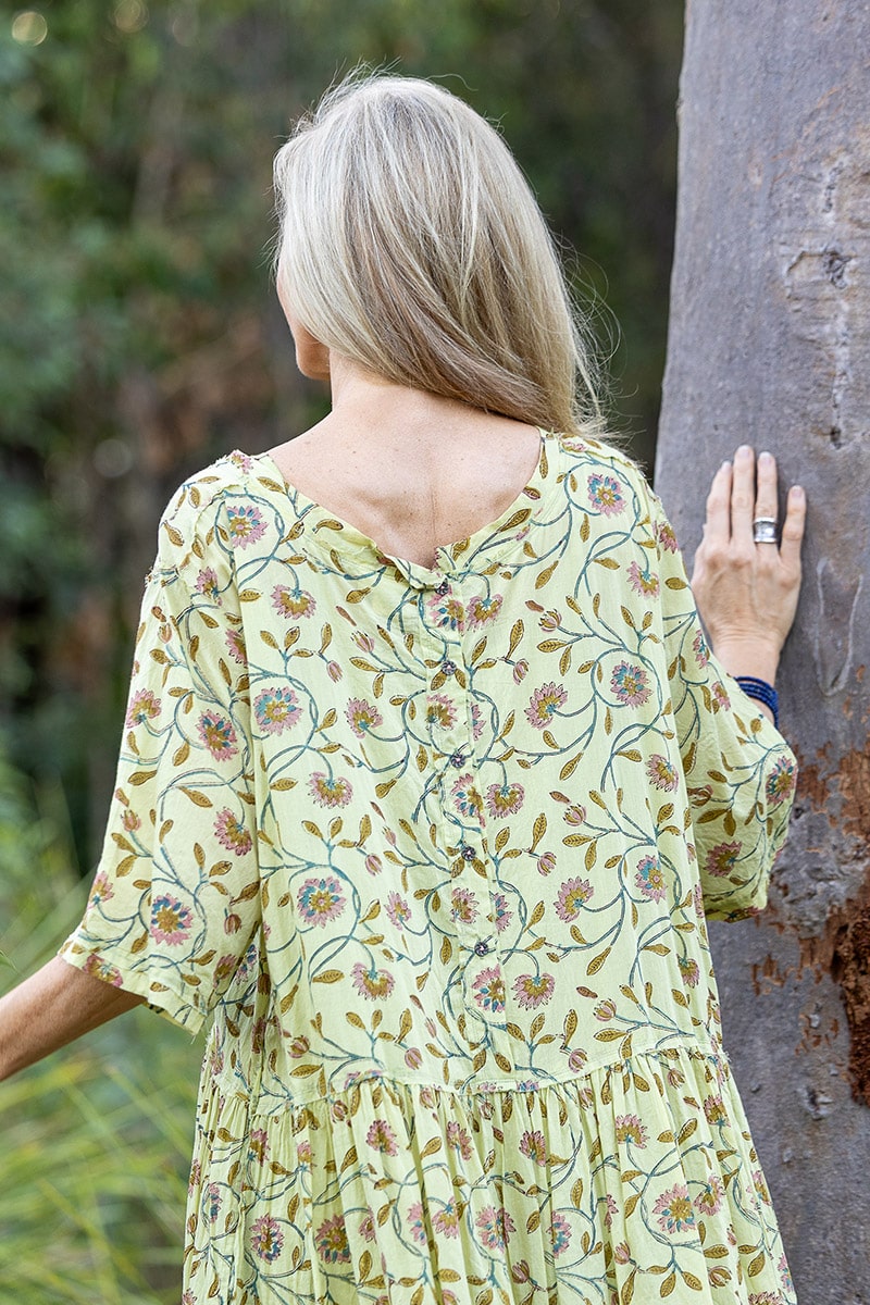 With a drop waist that gathers and falls into a flowing skirt, she moves with quiet freedom – a softness of spirit woven through every fold. Contrast-stitched metal buttons trail down the back (or front – sheโs fully reversible), adding a hint of character to her thoughtful design.
