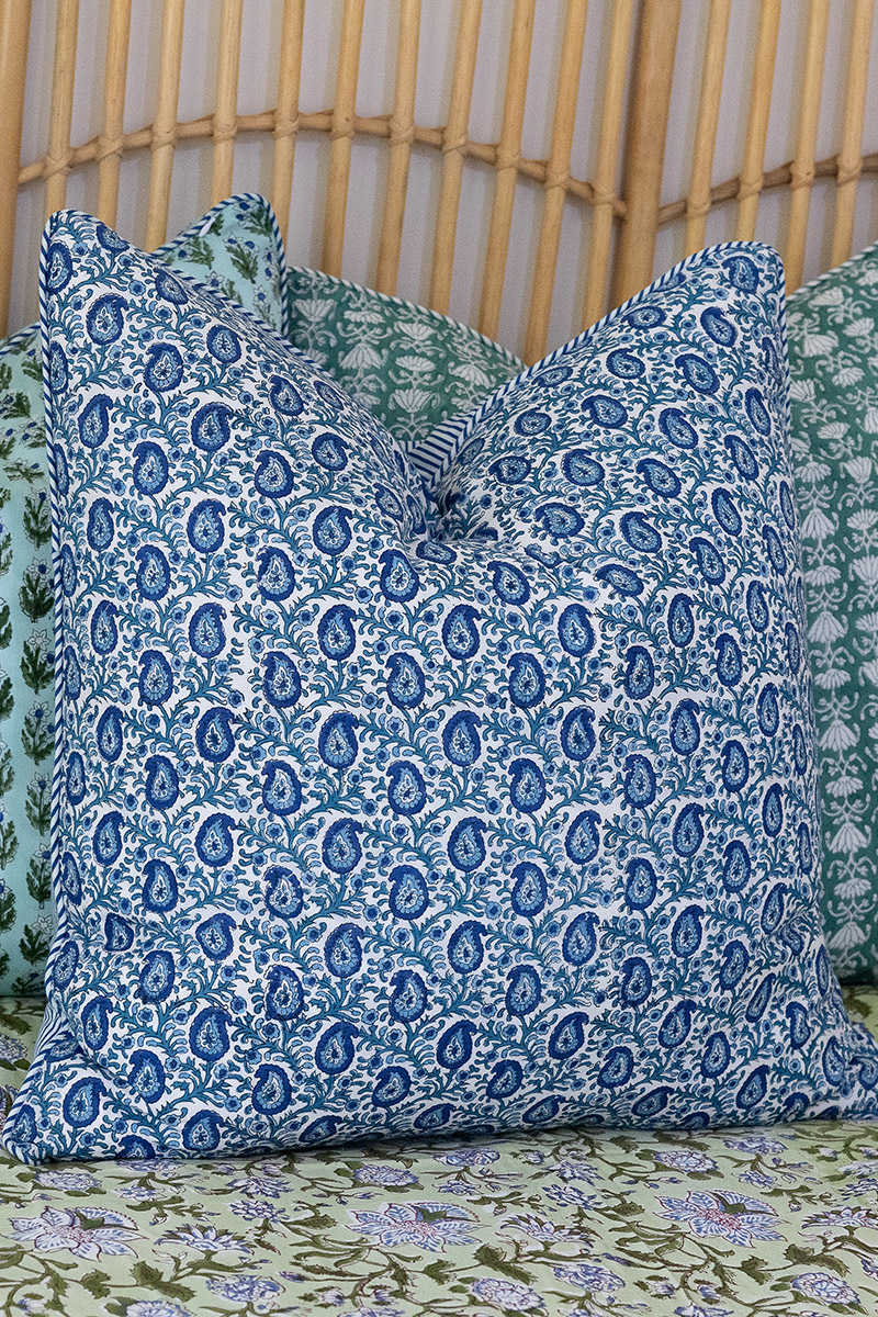 Some styles carry their print all over, while others are thoughtfully finished with a coordinating stripe on the reverse. Exquisite piping frames each cover, adding a soft, tailored edge, and a discreet zip sits along one side, keeping the silhouette clean and refined.
