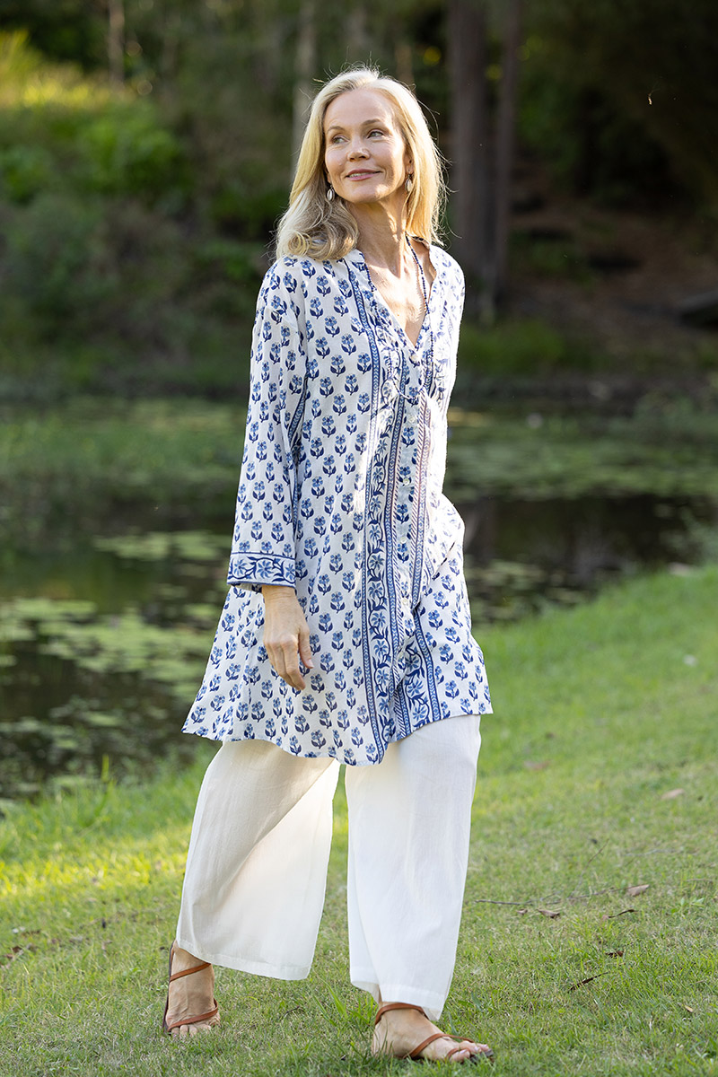 Long sleeves, a gentle mandarin collar, and buttons down the front create a relaxed yet polished look, while subtle border prints along the centre front and cuffs add delicate detail.