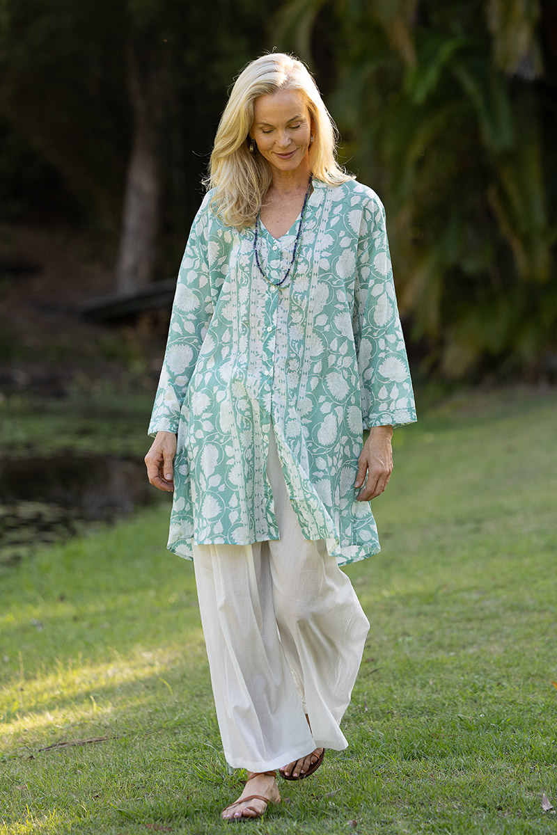 Long sleeves, a gentle mandarin collar, and buttons down the front create a relaxed yet polished look, while subtle border prints along the centre front and cuffs add delicate detail.