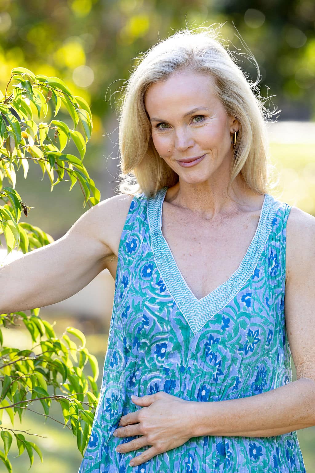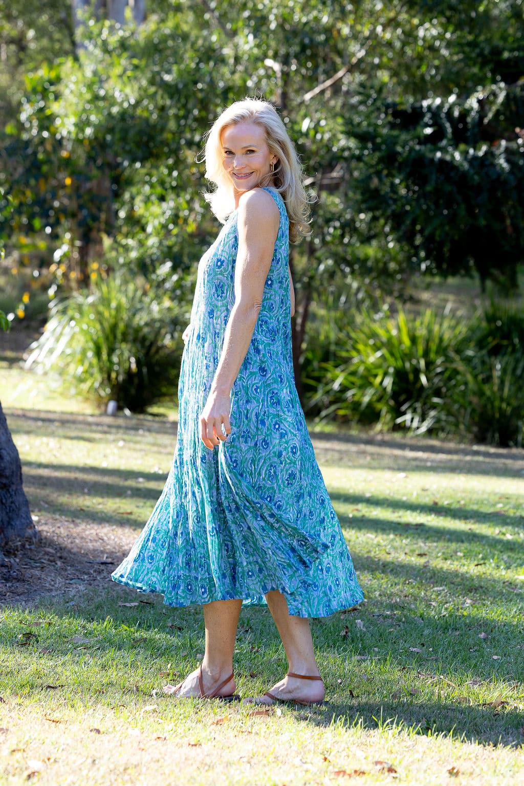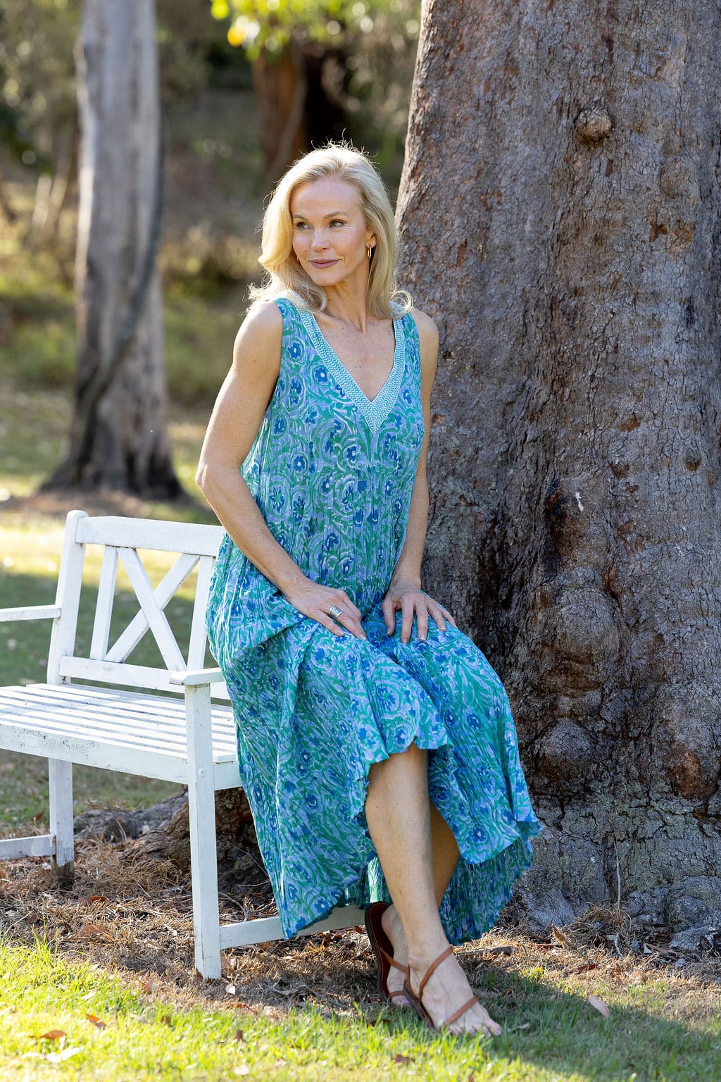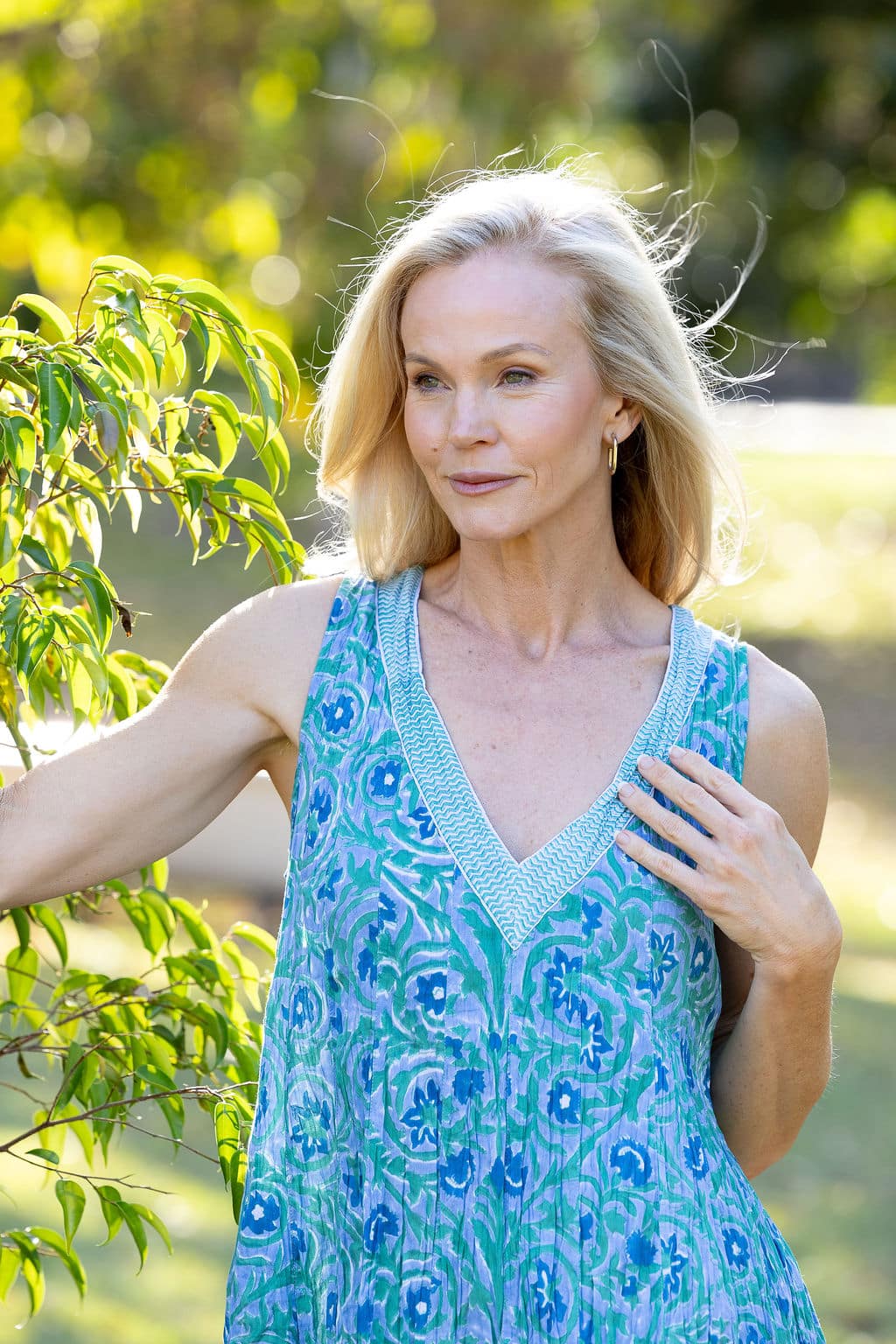 Her deep V neckline is framed with a hand-printed border, drawing the eye without effort, while her sleeveless, free-spirited shape invites the skin to breathe. Generous through the body yet fluid in form, Mevlana flatters every shape and moves with natural rhythm.