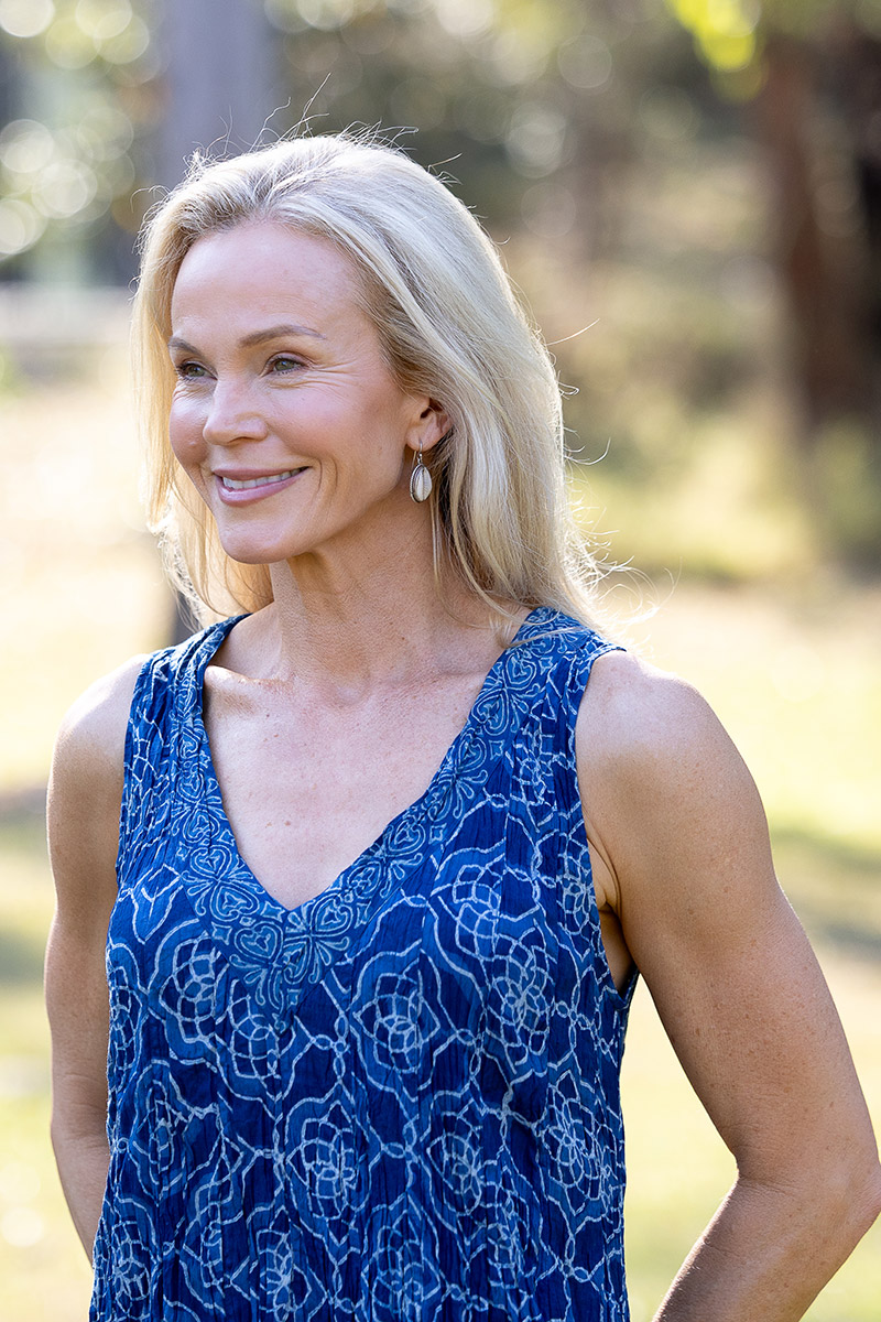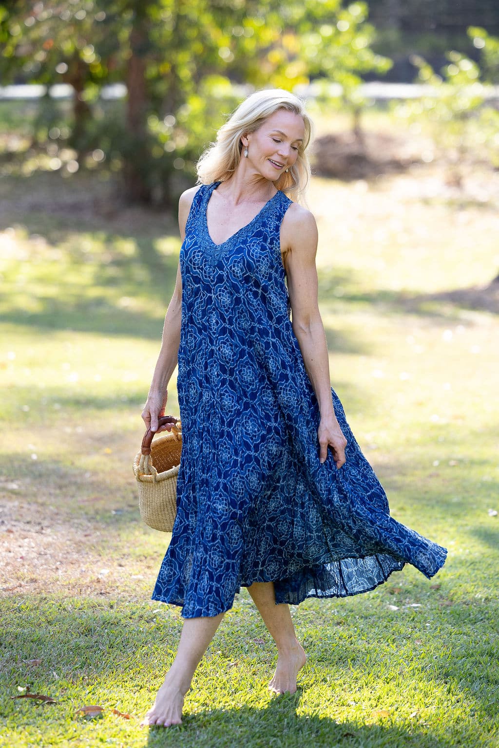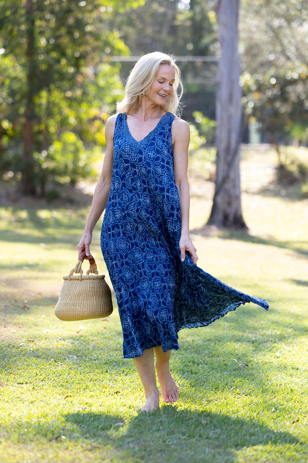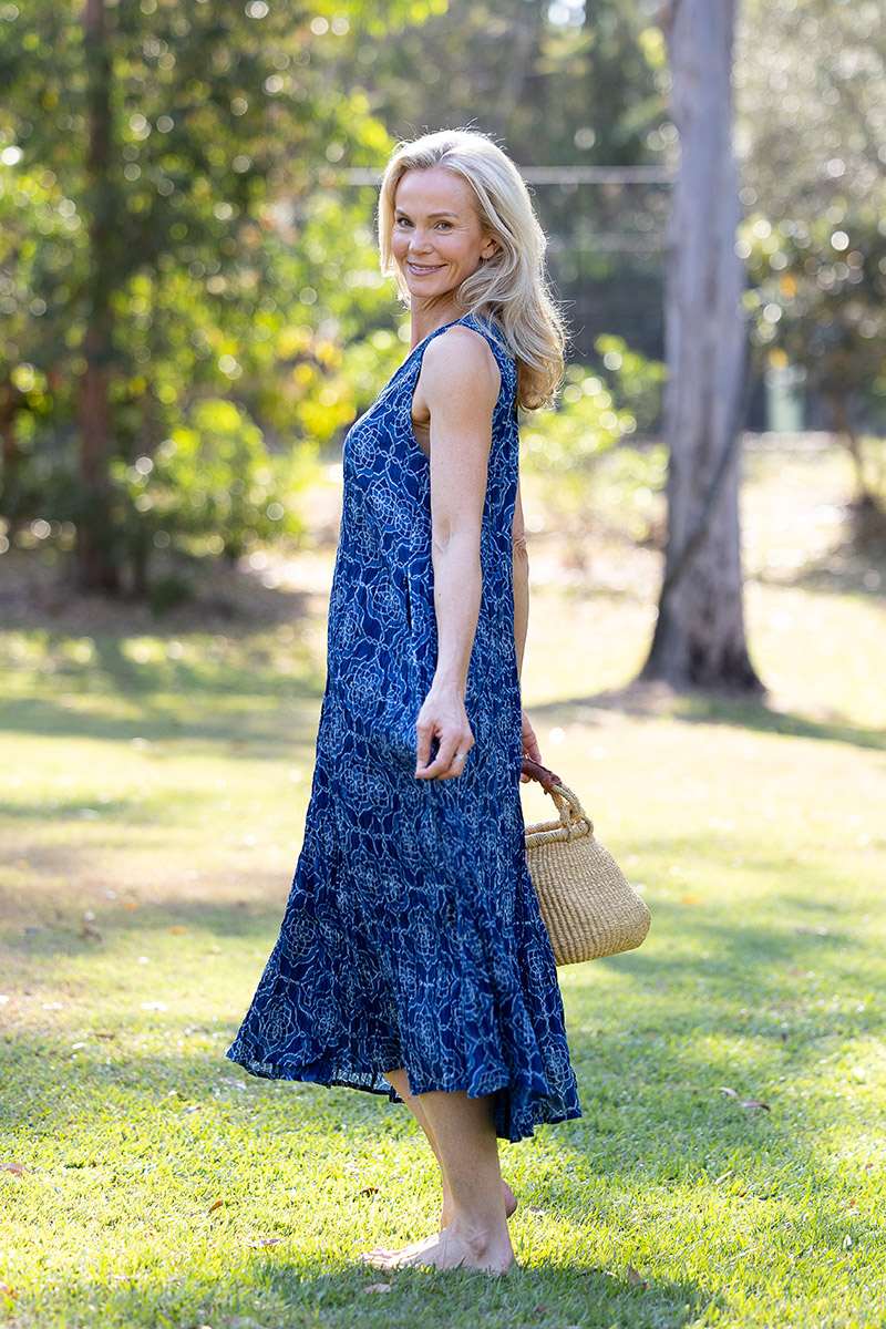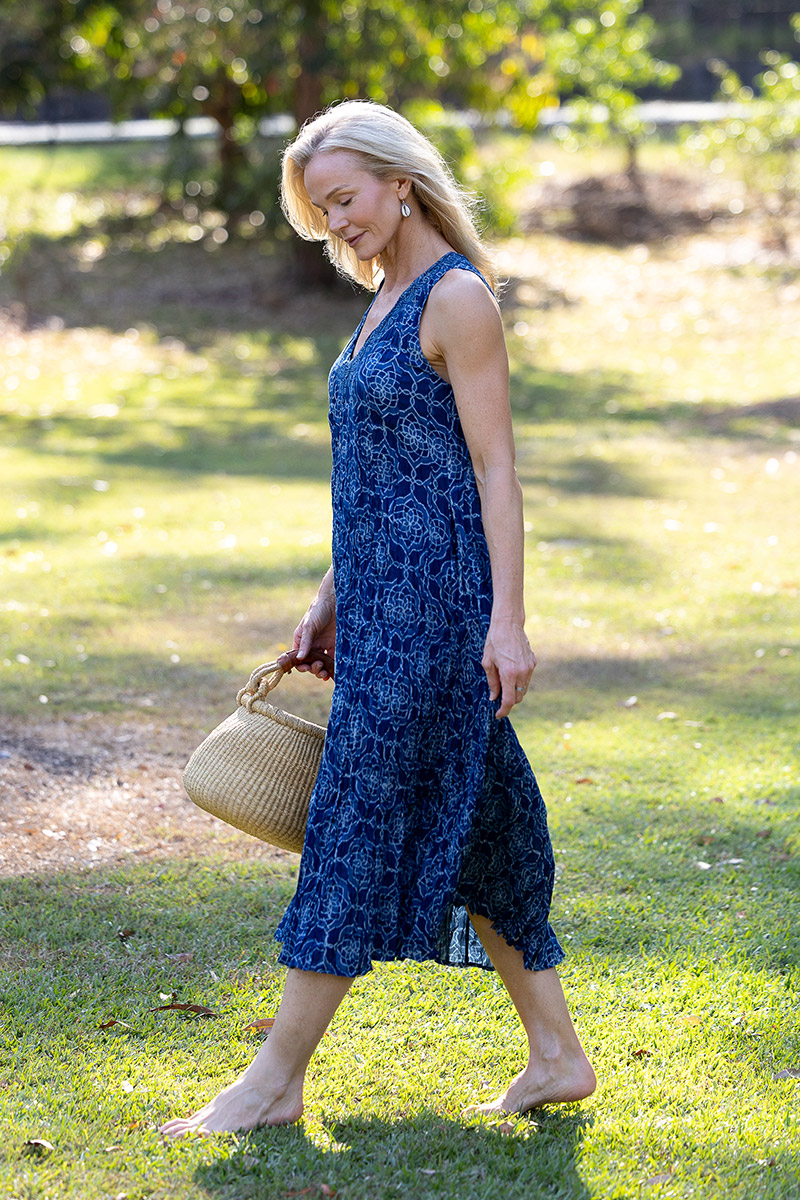 Her deep V neckline is framed with a hand-printed border, drawing the eye without effort, while her sleeveless, free-spirited shape invites the skin to breathe. Generous through the body yet fluid in form, Mevlana flatters every shape and moves with natural rhythm.