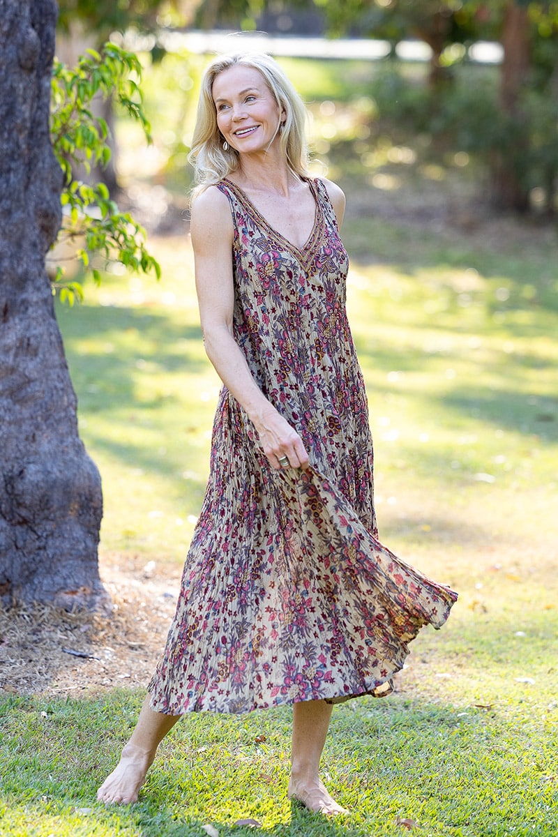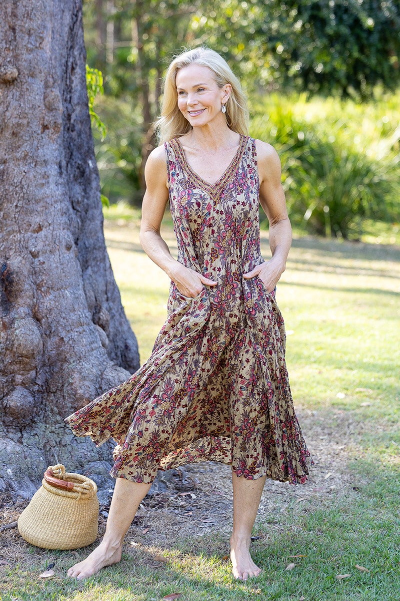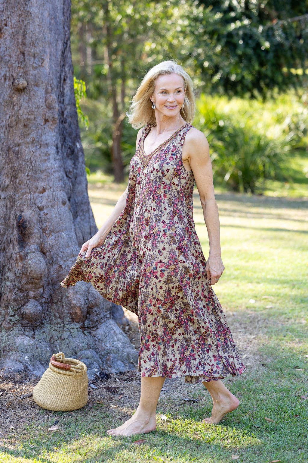 Her deep V neckline is framed with a hand-printed border, drawing the eye without effort, while her sleeveless, free-spirited shape invites the skin to breathe. Generous through the body yet fluid in form, Mevlana flatters every shape and moves with natural rhythm.