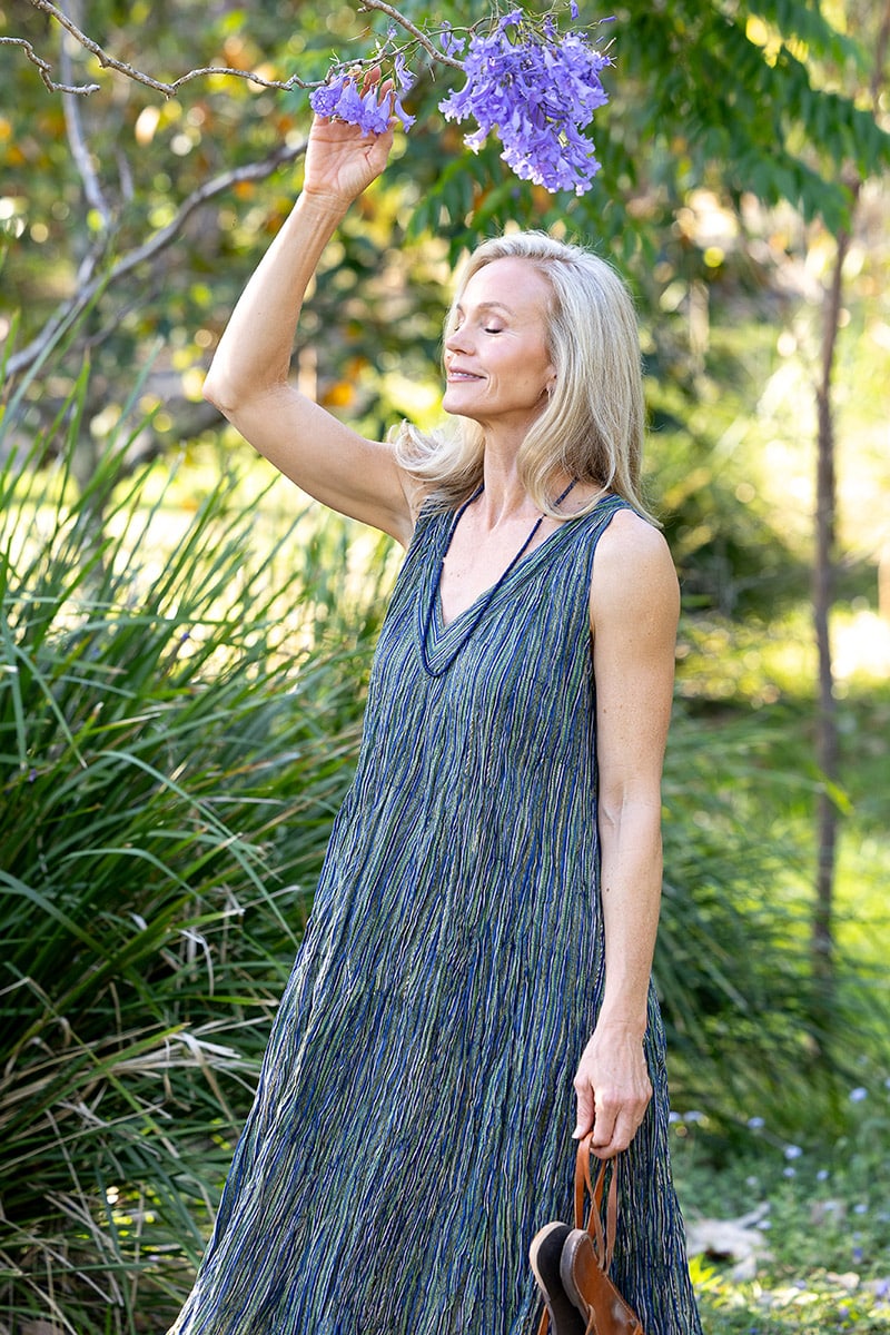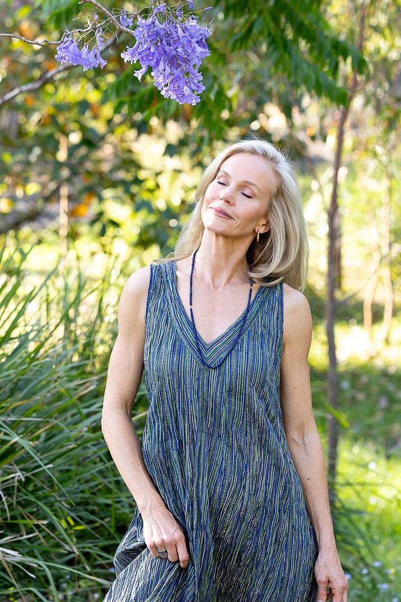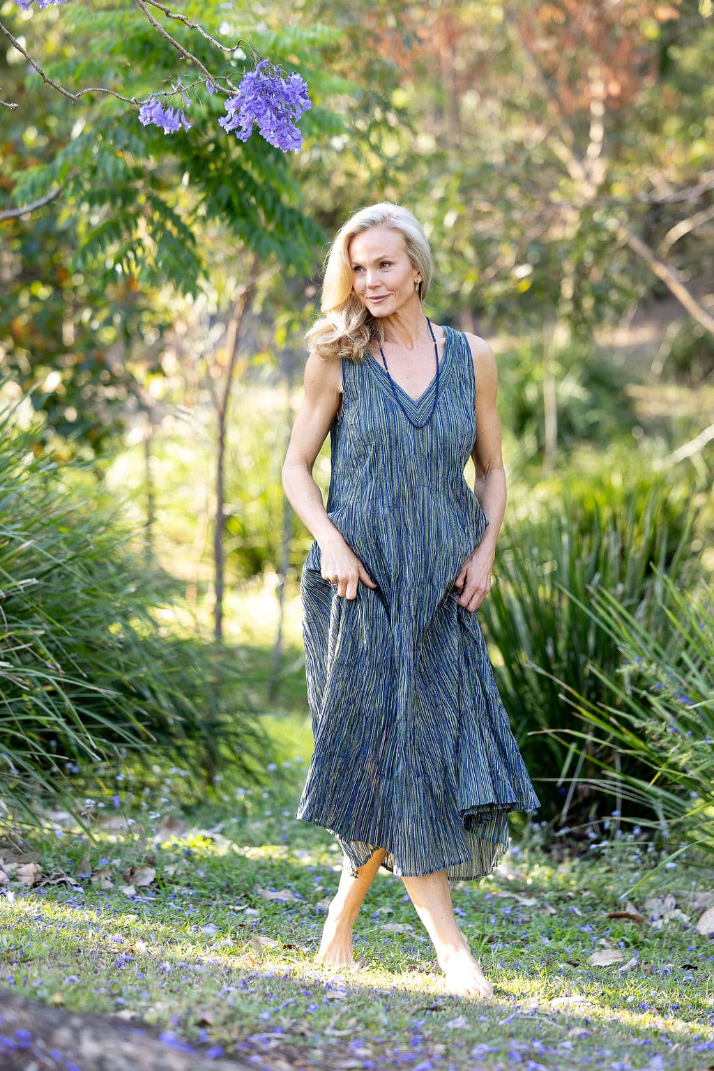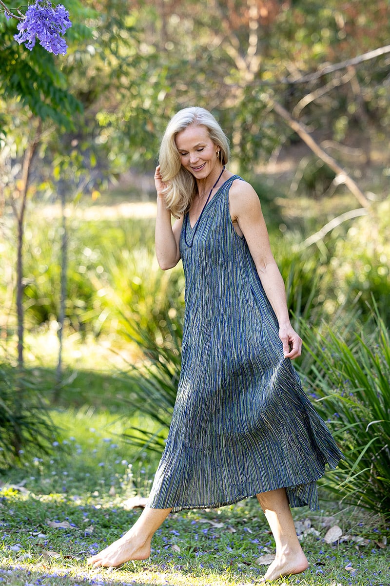 Her deep V neckline is framed with a hand-printed border, drawing the eye without effort, while her sleeveless, free-spirited shape invites the skin to breathe. Generous through the body yet fluid in form, Mevlana flatters every shape and moves with natural rhythm.