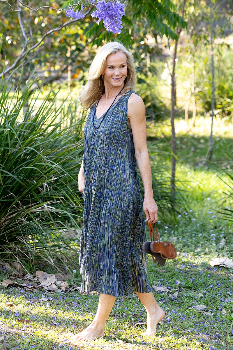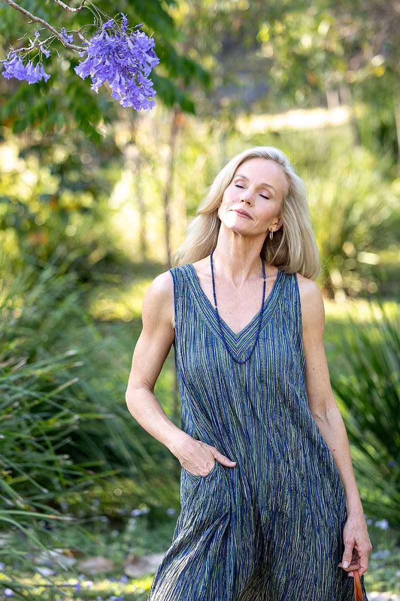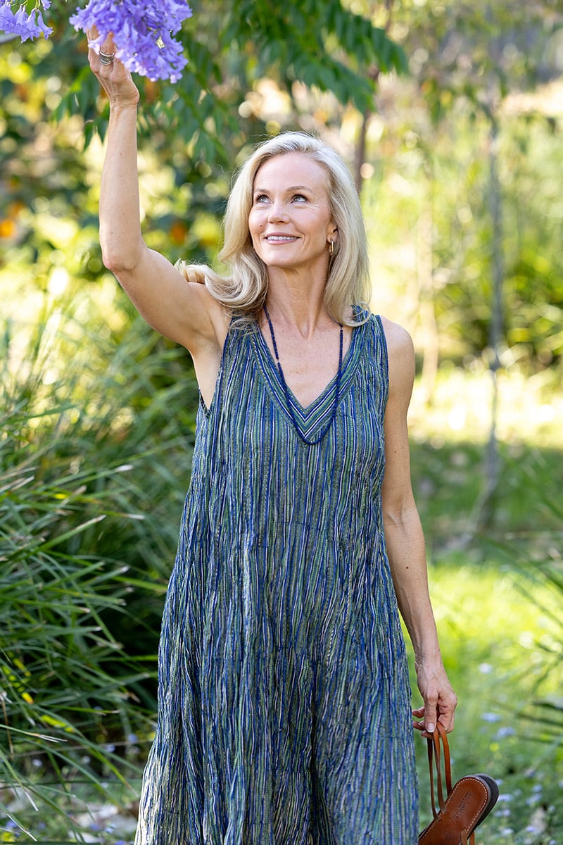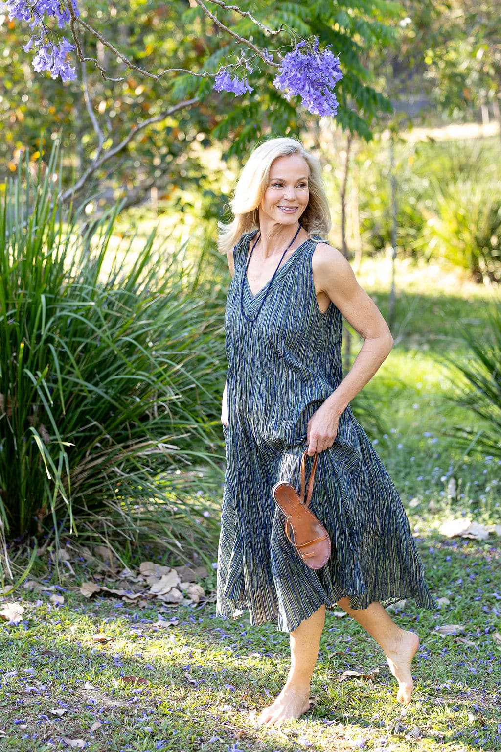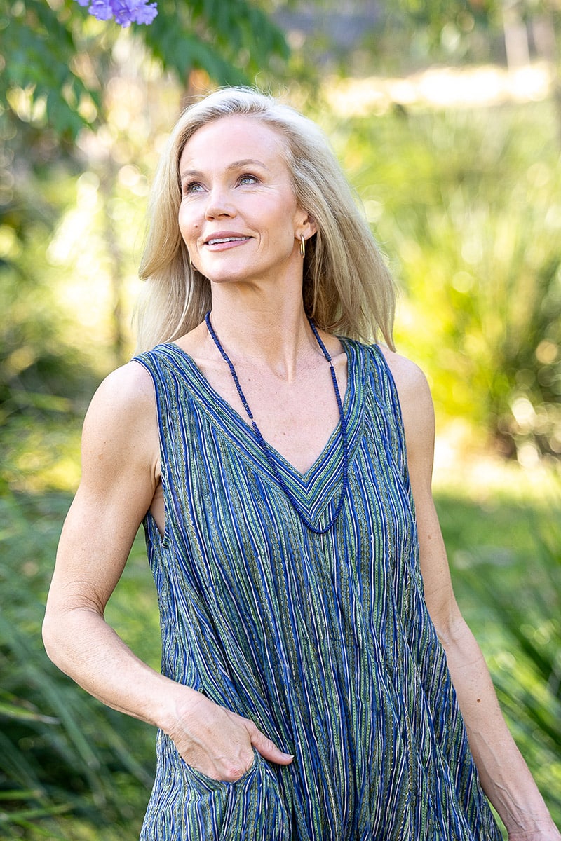Her deep V neckline is framed with a hand-printed border, drawing the eye without effort, while her sleeveless, free-spirited shape invites the skin to breathe. Generous through the body yet fluid in form, Mevlana flatters every shape and moves with natural rhythm.