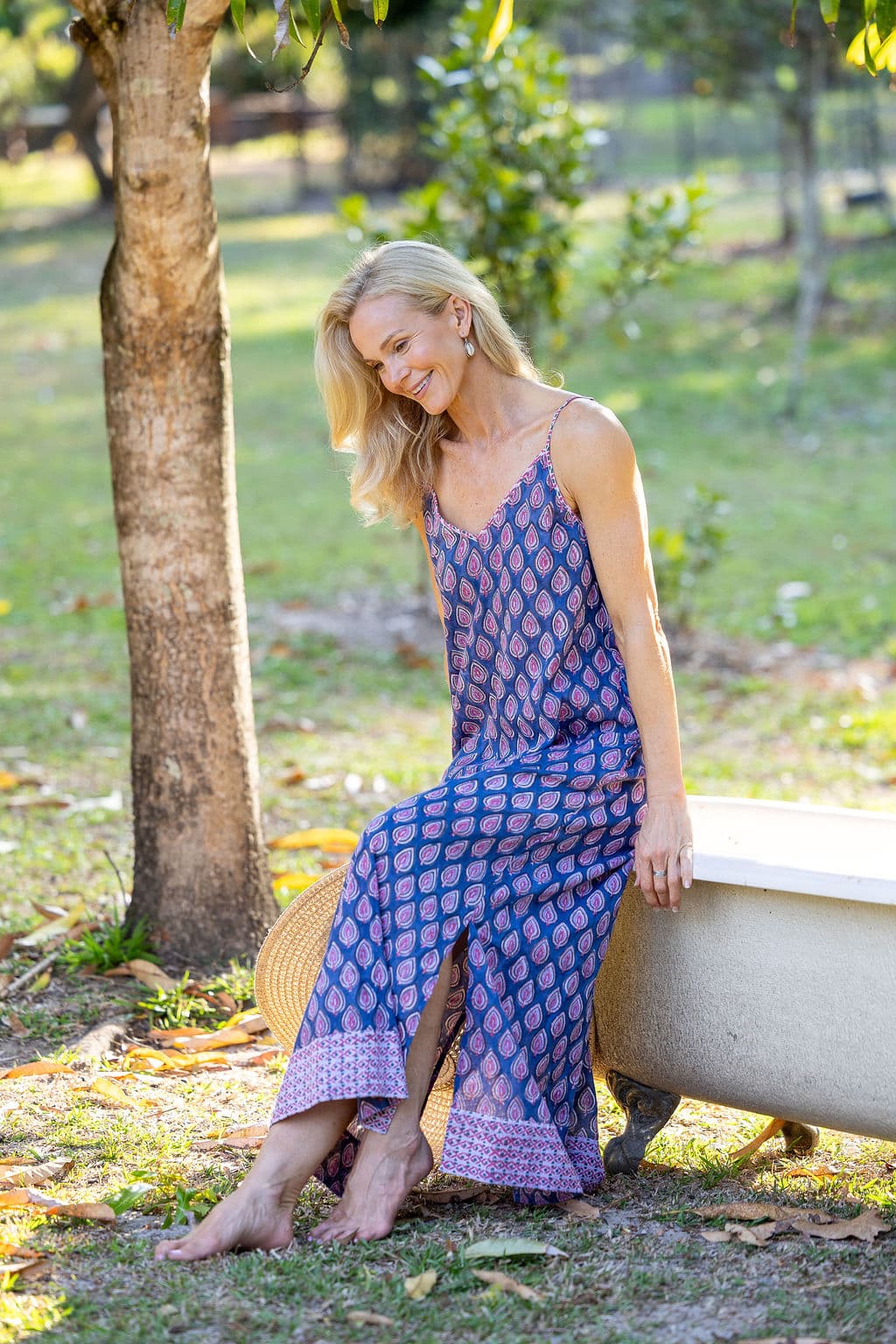 Effortlessly sleek, endlessly summerย  the Savannah is a streamlined maxi designed for sunlit days and warm evening breezes. Minimalistic in shape but full of subtle, sensual details, she features a deep V-neckline and backline, adjustable spaghetti straps, and a contrasting bind and hemline border that frames the silhouette with understated elegance.