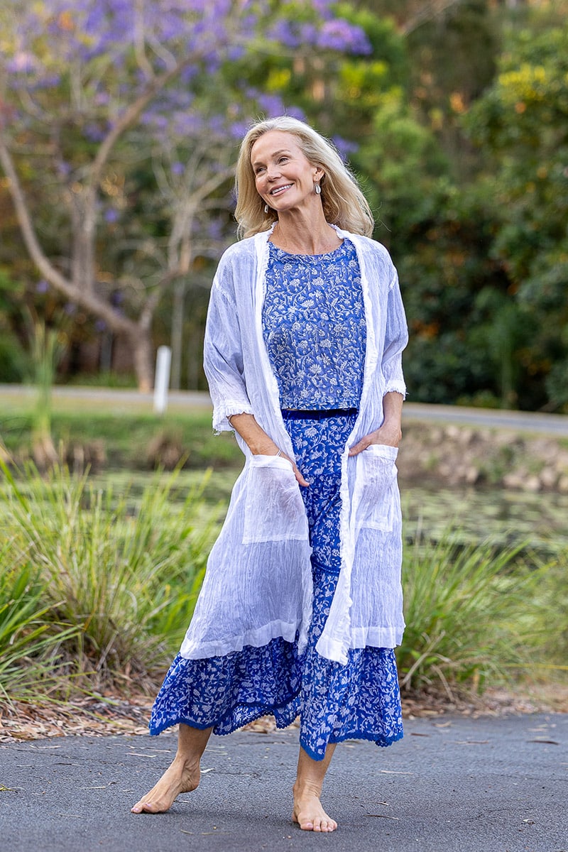Raw-edged frills, loose and lived-in. Deep, easy pockets for life’s little essentials.