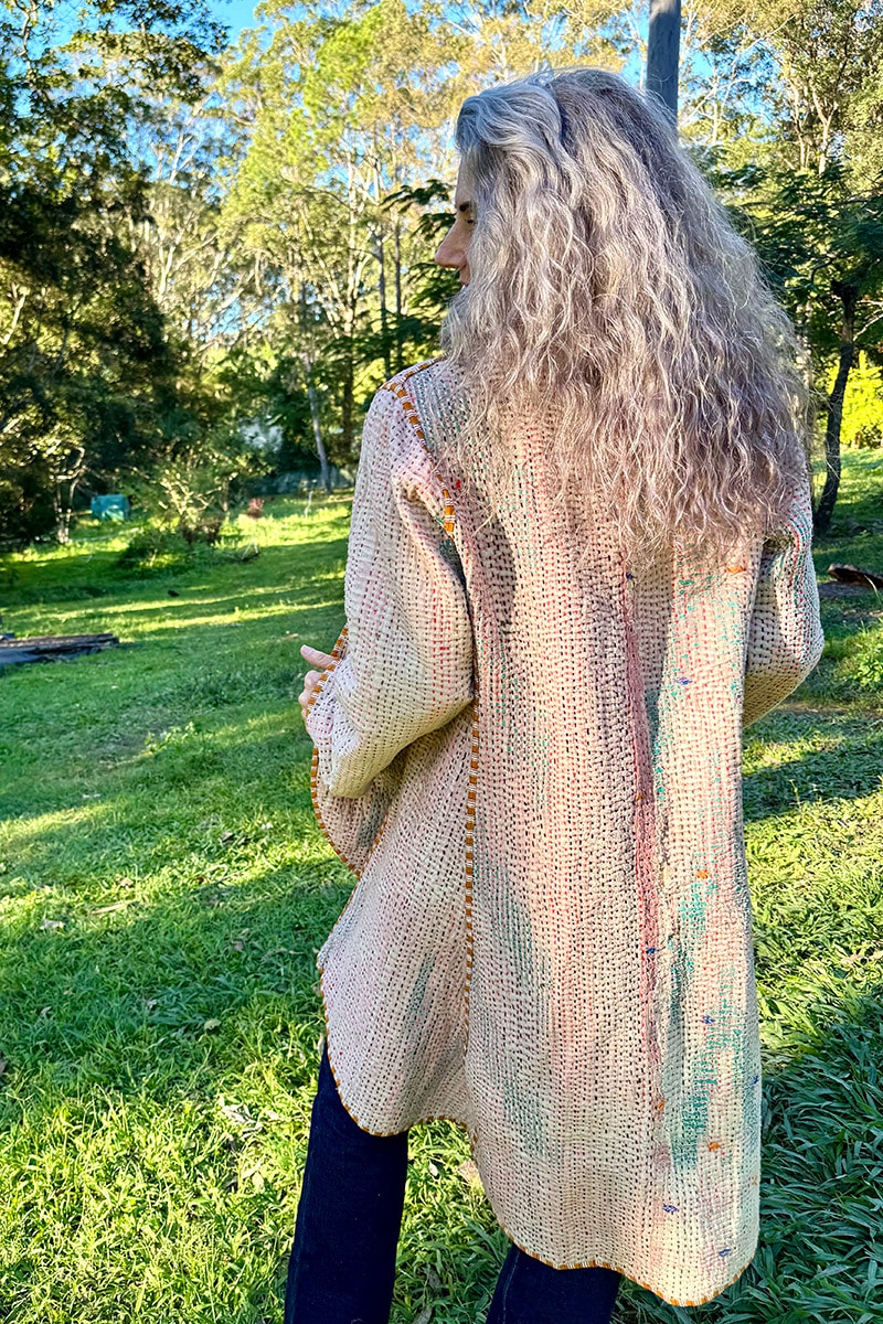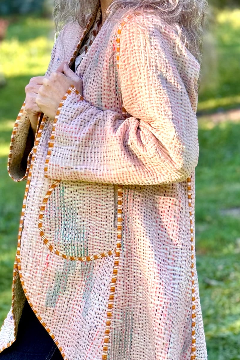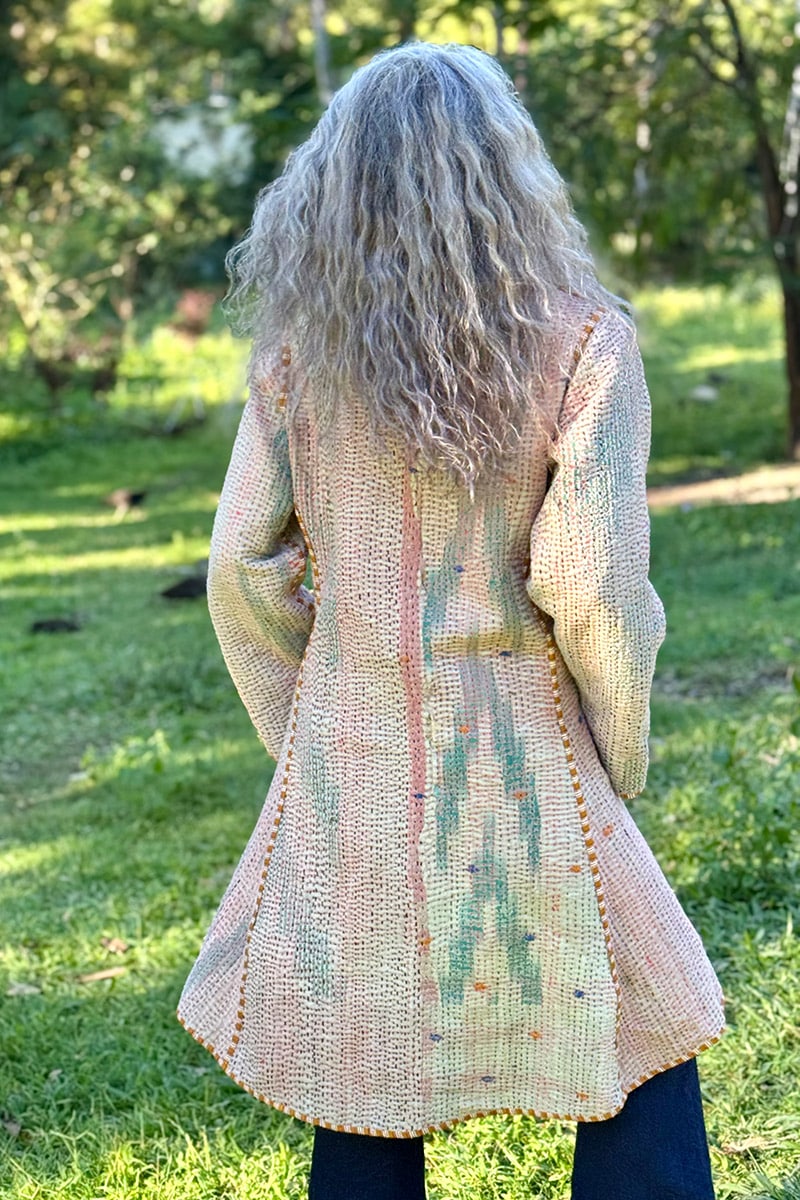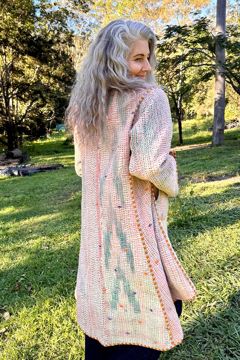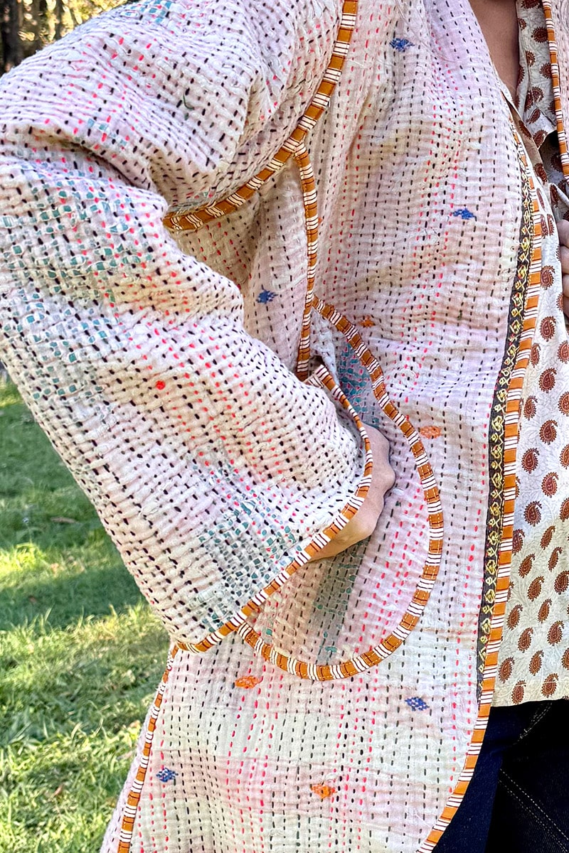 Hand-stitched with care from up-cycled vintage Kantha’s, each coat is a one-of-a-kind masterpiece, making it the perfect statement piece for your wardrobe. With pockets on both sides and long sleeves, this coat seamlessly combines practicality and earthy elegance.