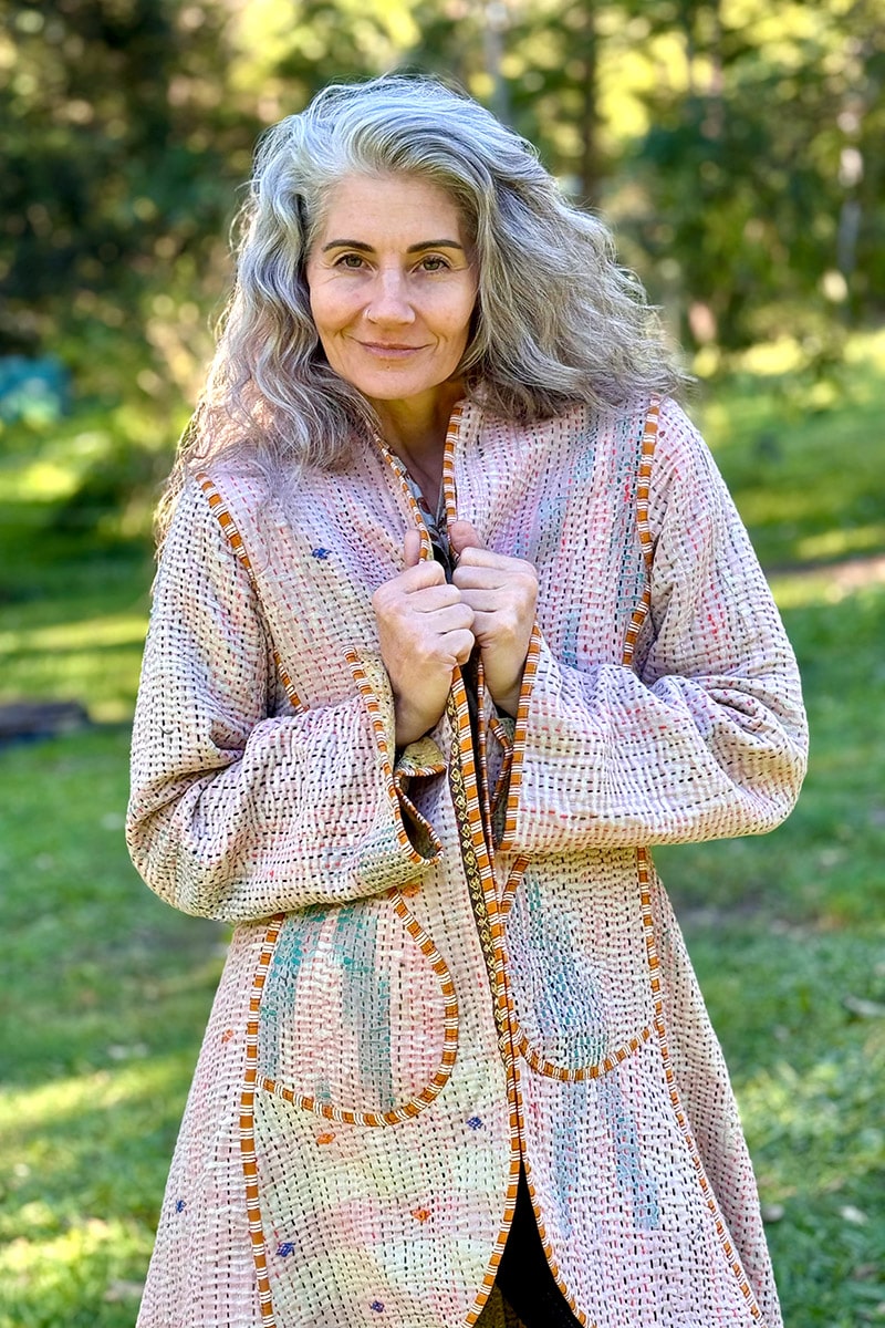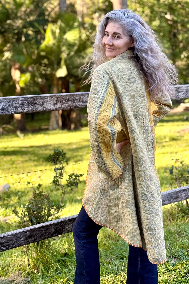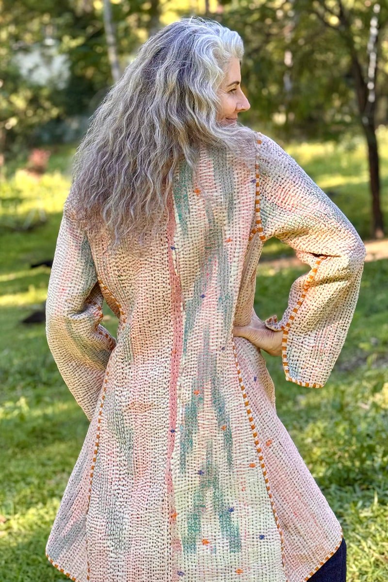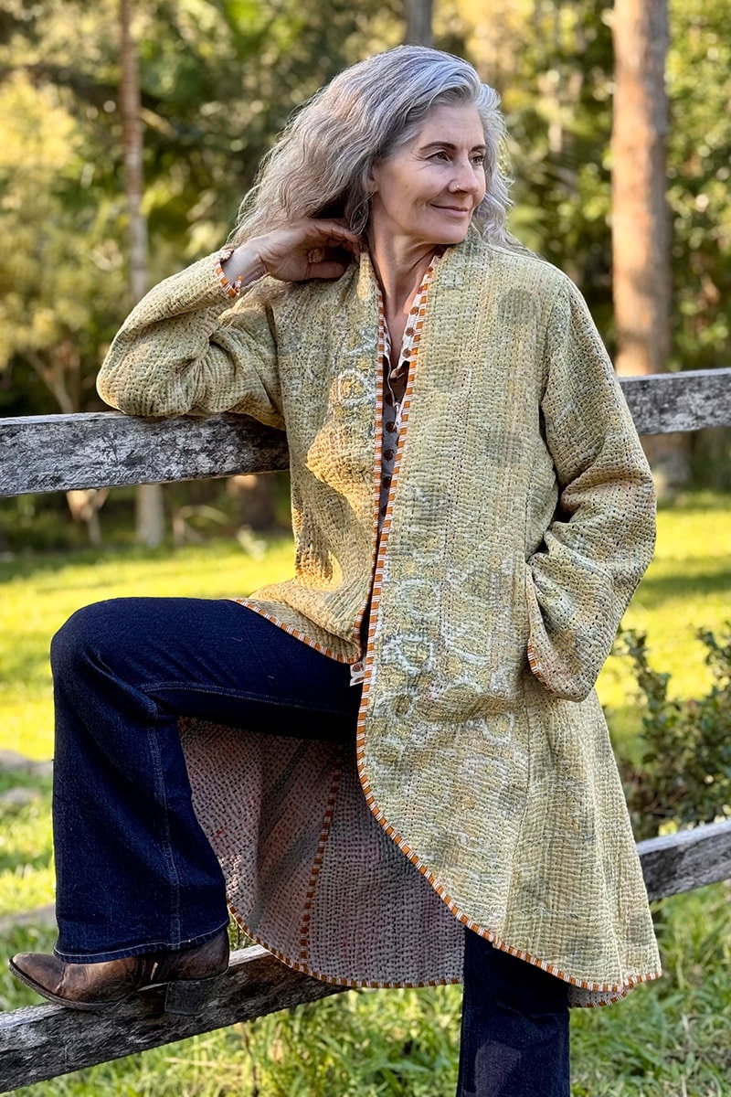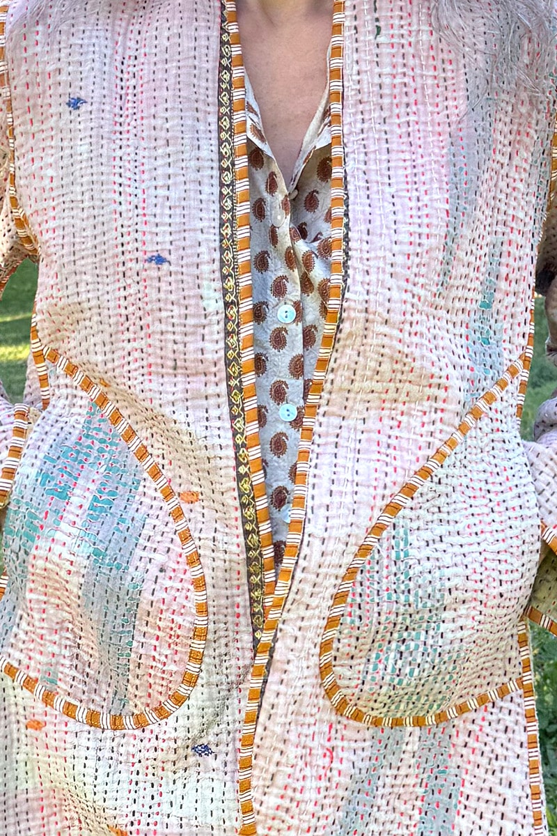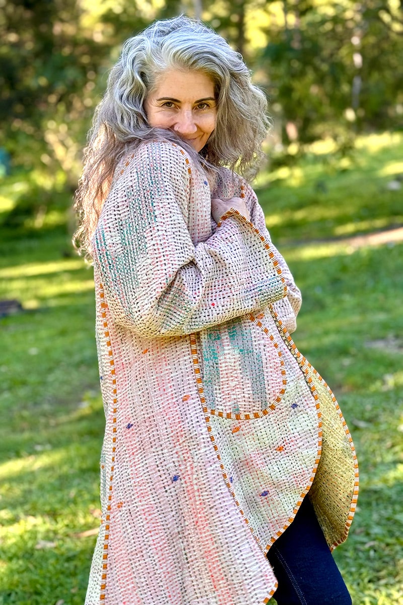 Hand-stitched with care from up-cycled vintage Kantha’s, each coat is a one-of-a-kind masterpiece, making it the perfect statement piece for your wardrobe. With pockets on both sides and long sleeves, this coat seamlessly combines practicality and earthy elegance.