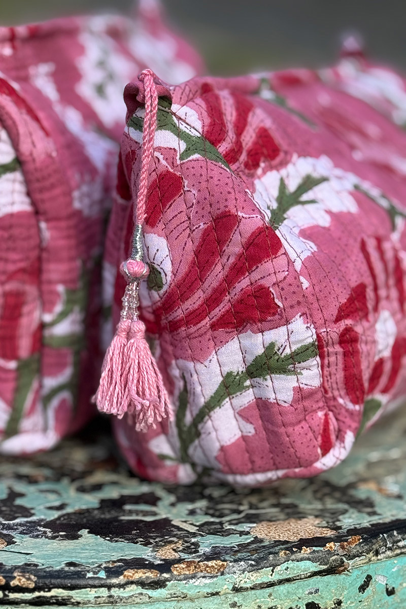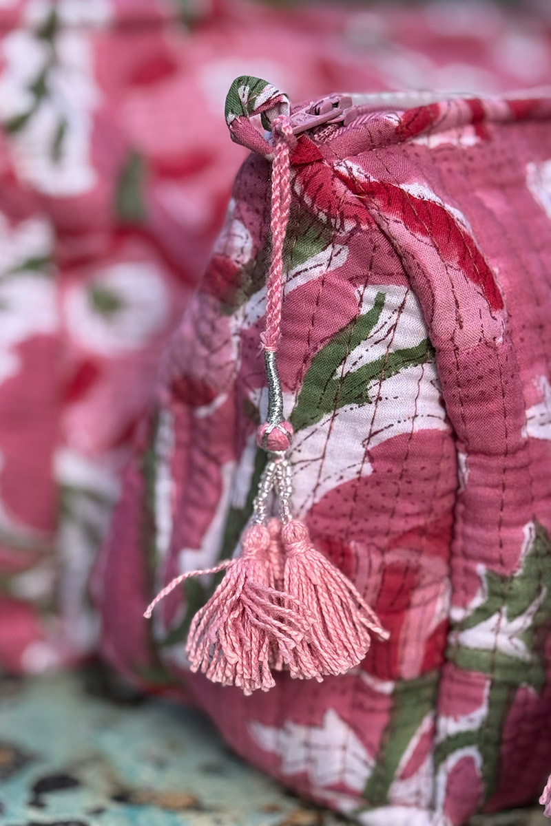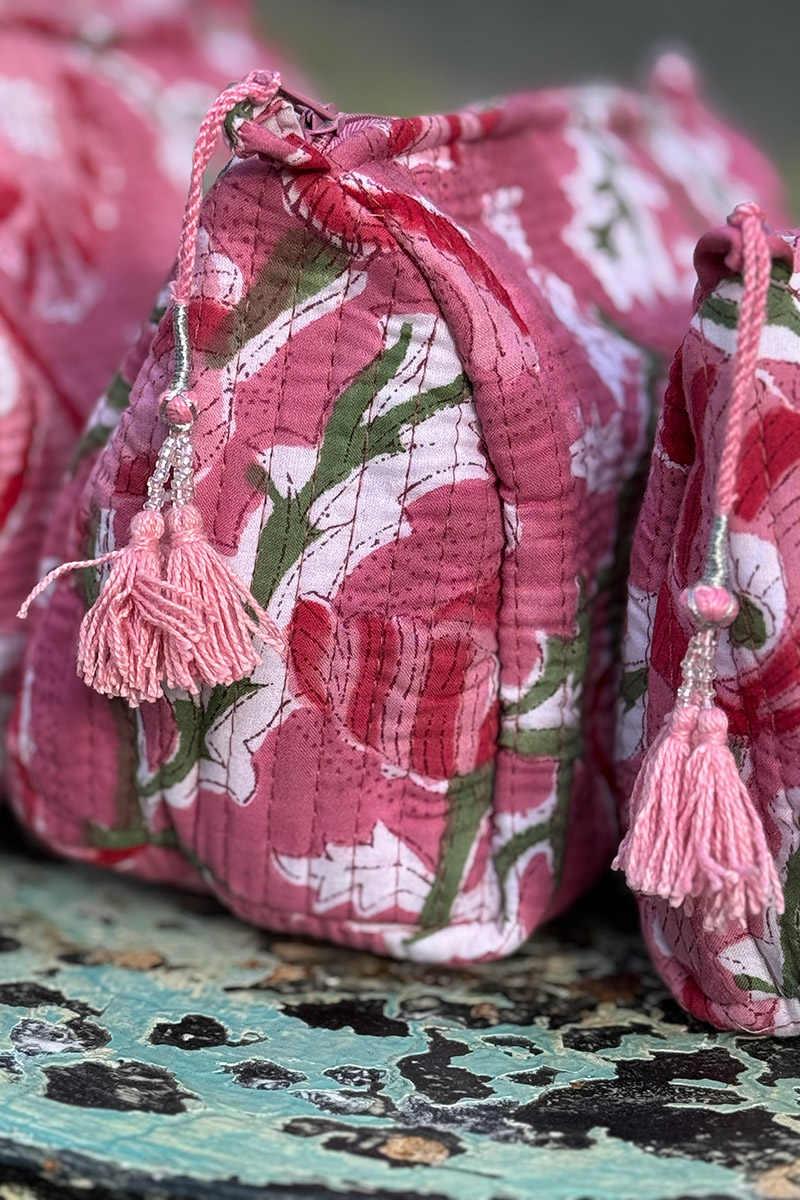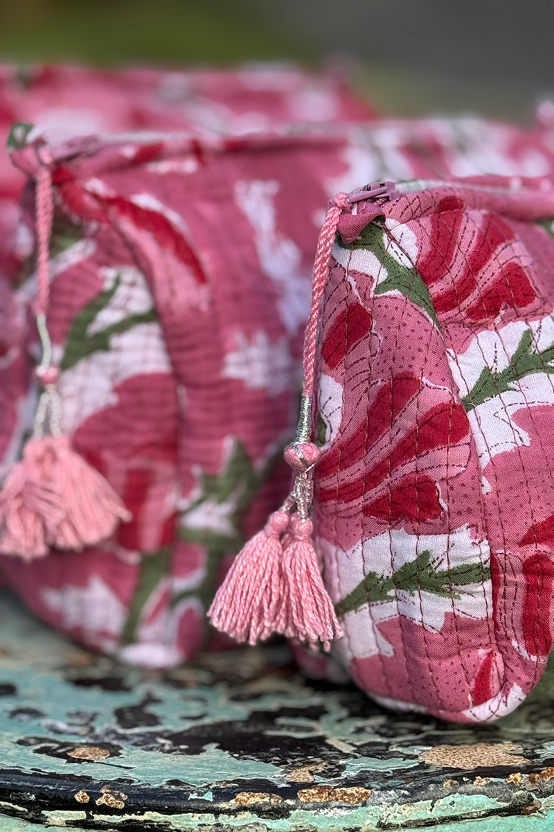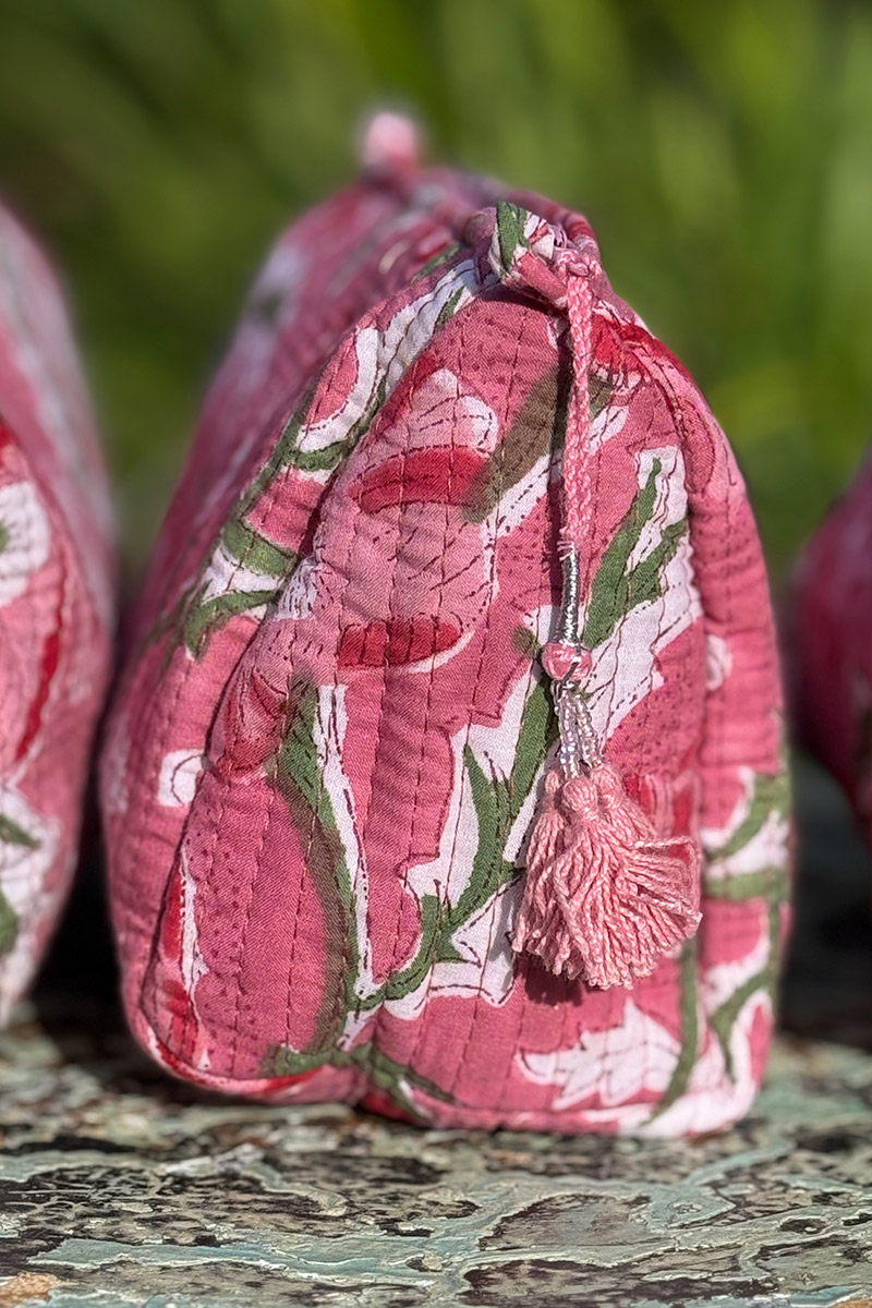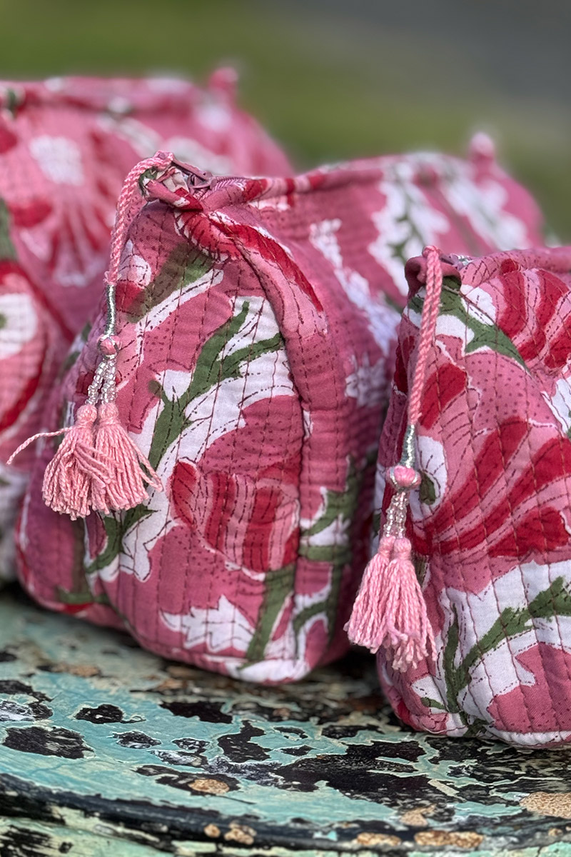 Our stunning Hand Block Printed Wash bags are made from 100% Cotton (outer), have a plastic inner lining with pockets, and are available in three sizes. Small | Medium | Large.