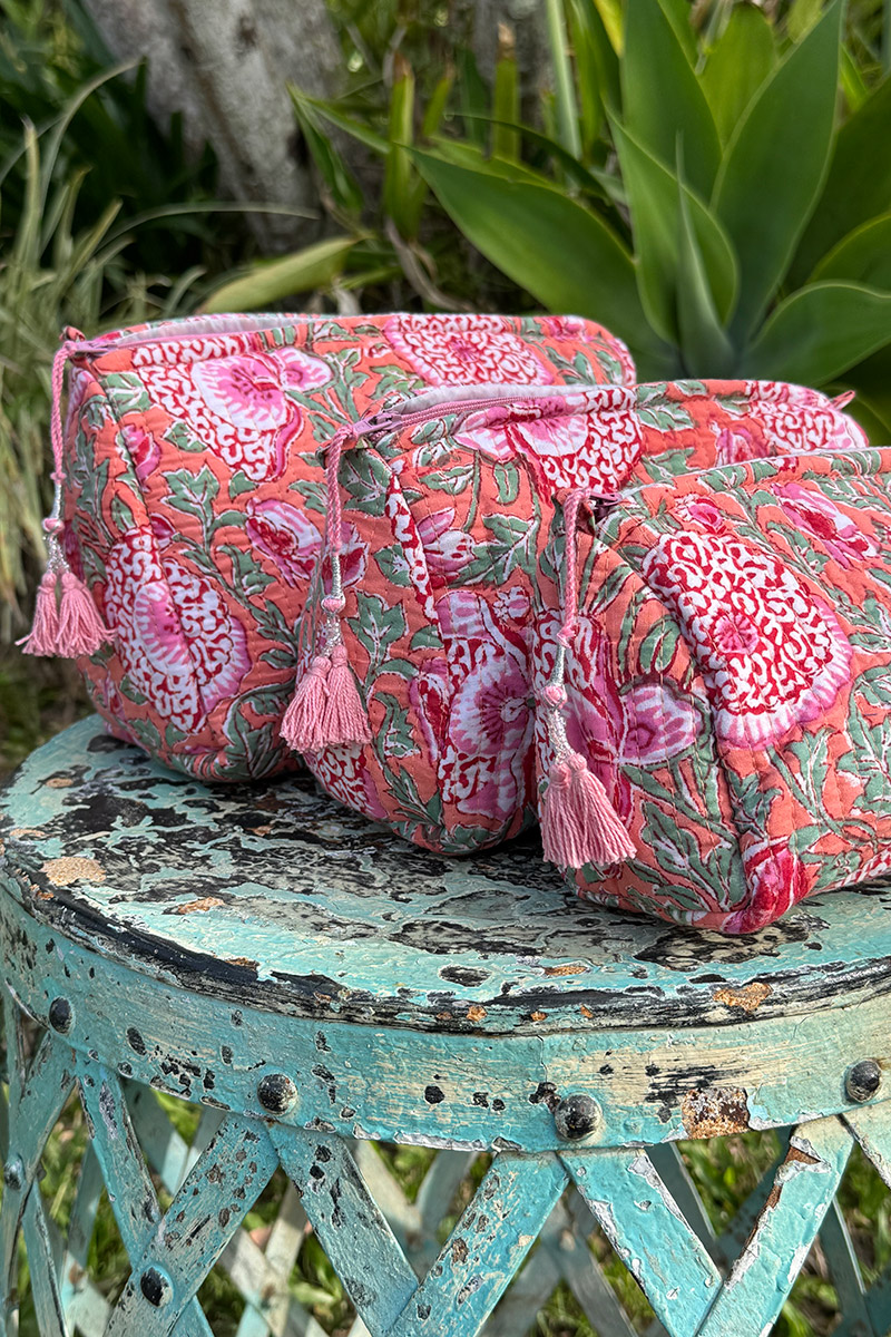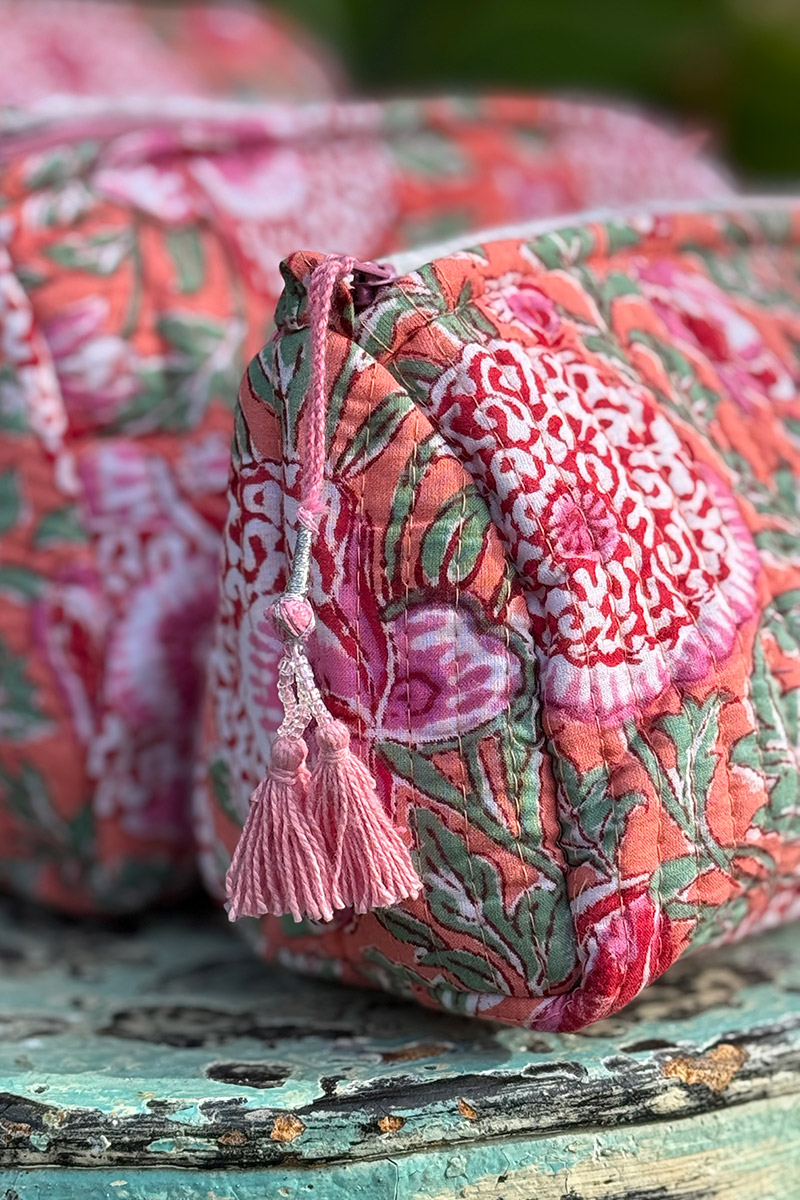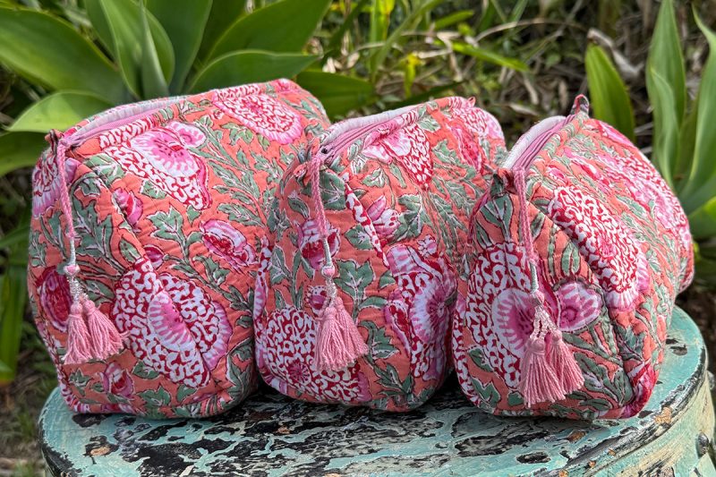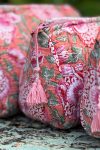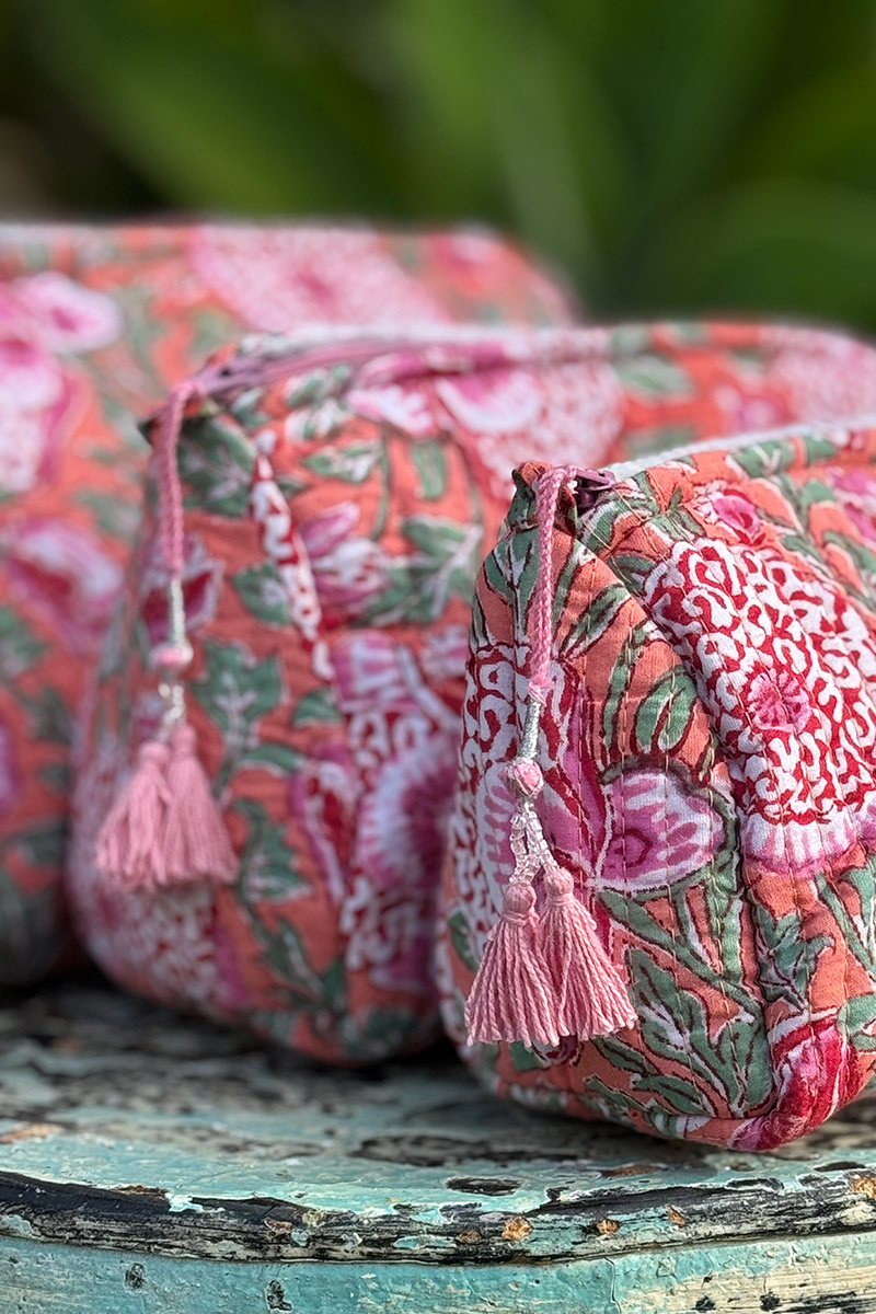 Our stunning Hand Block Printed Wash bags are made from 100% Cotton (outer), have a plastic inner lining with pockets, and are available in three sizes. Small | Medium | Large.