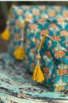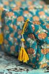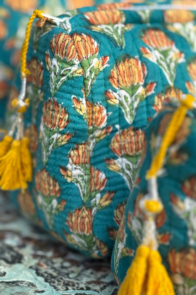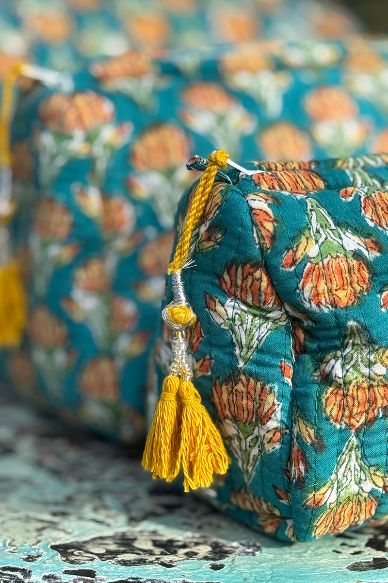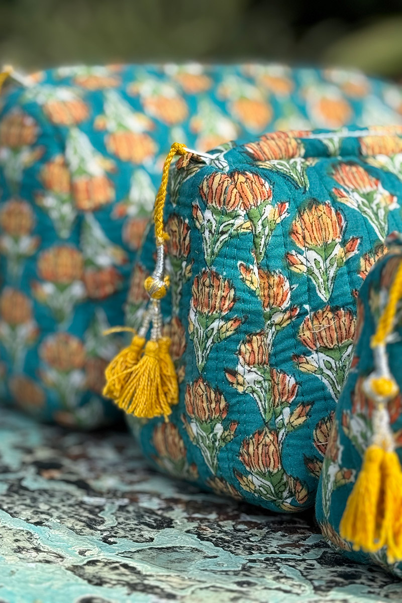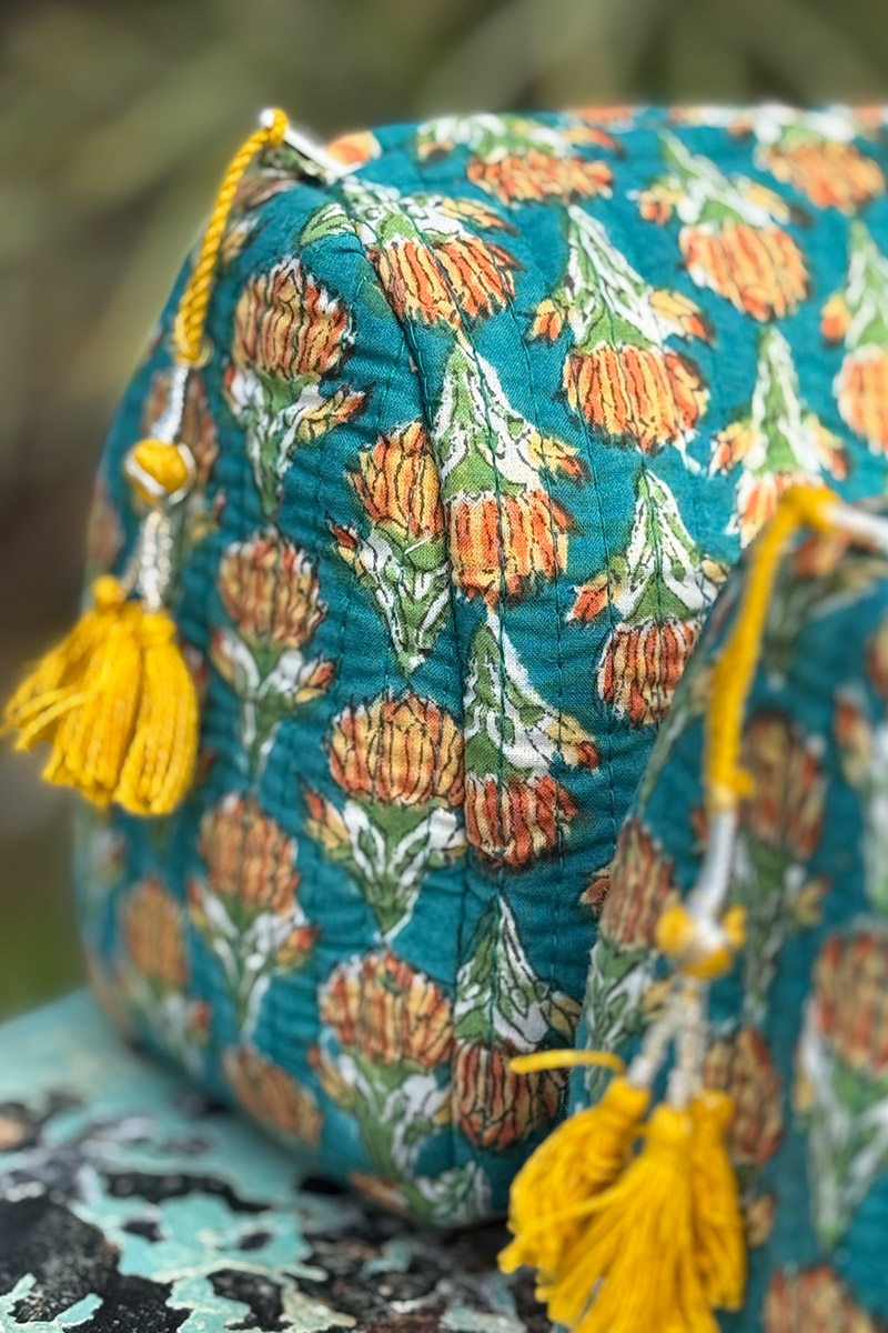 Our stunning Hand Block Printed Wash bags are made from 100% Cotton (outer), have a plastic inner lining with pockets, and are available in three sizes. Small | Medium | Large.