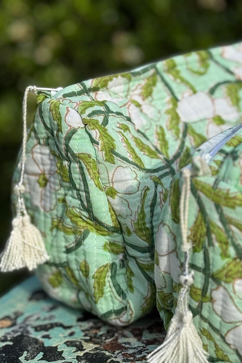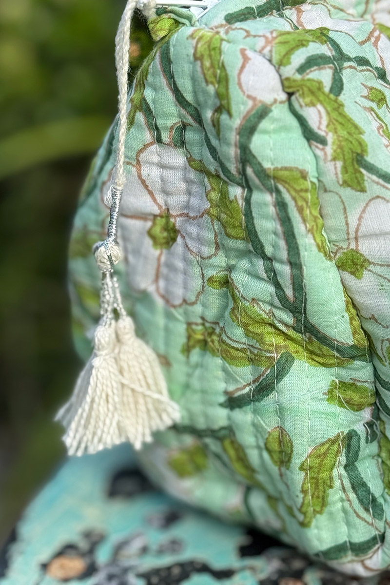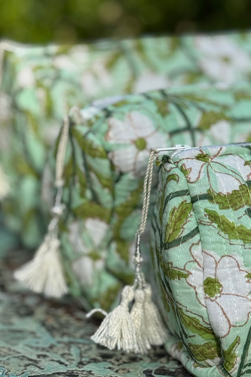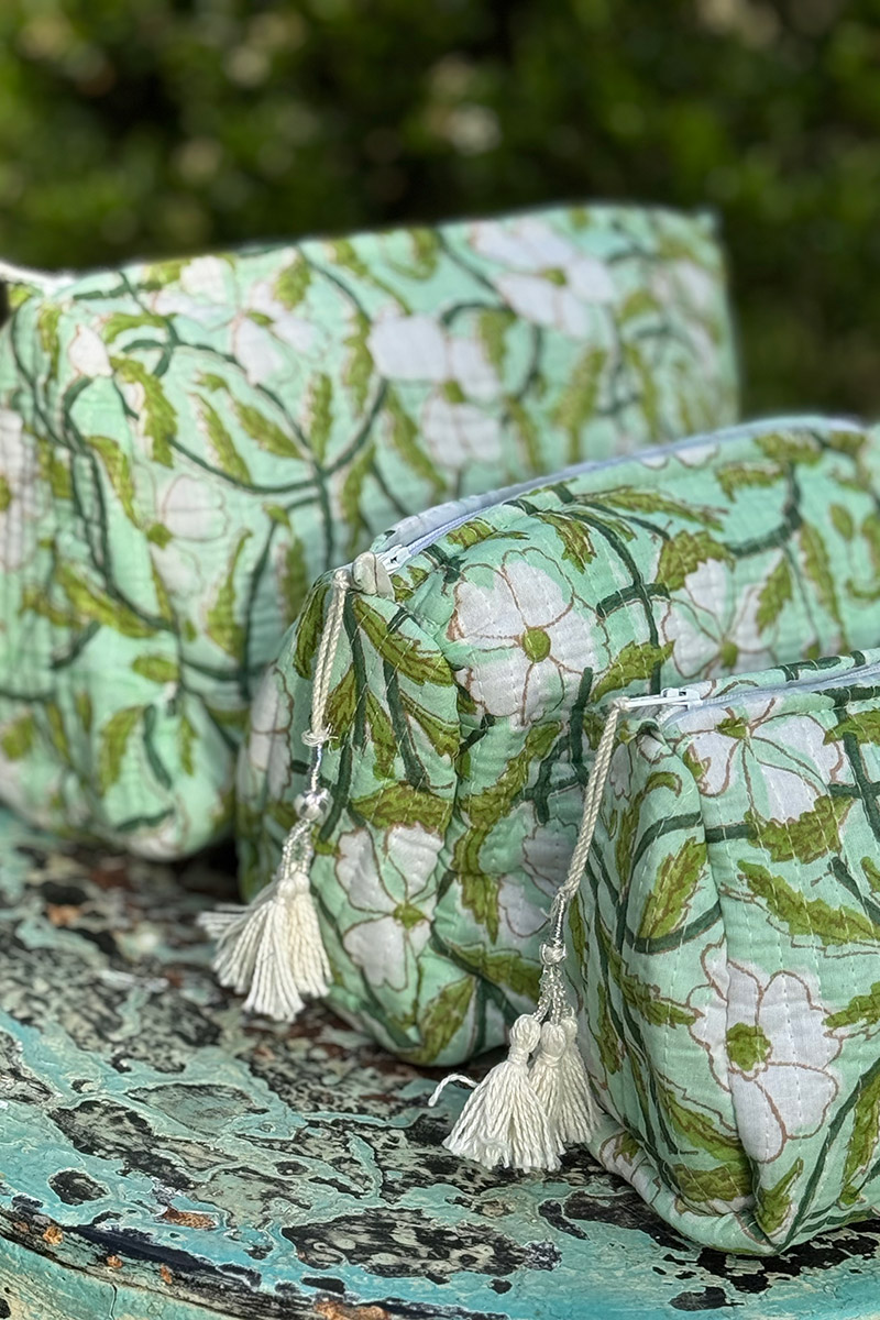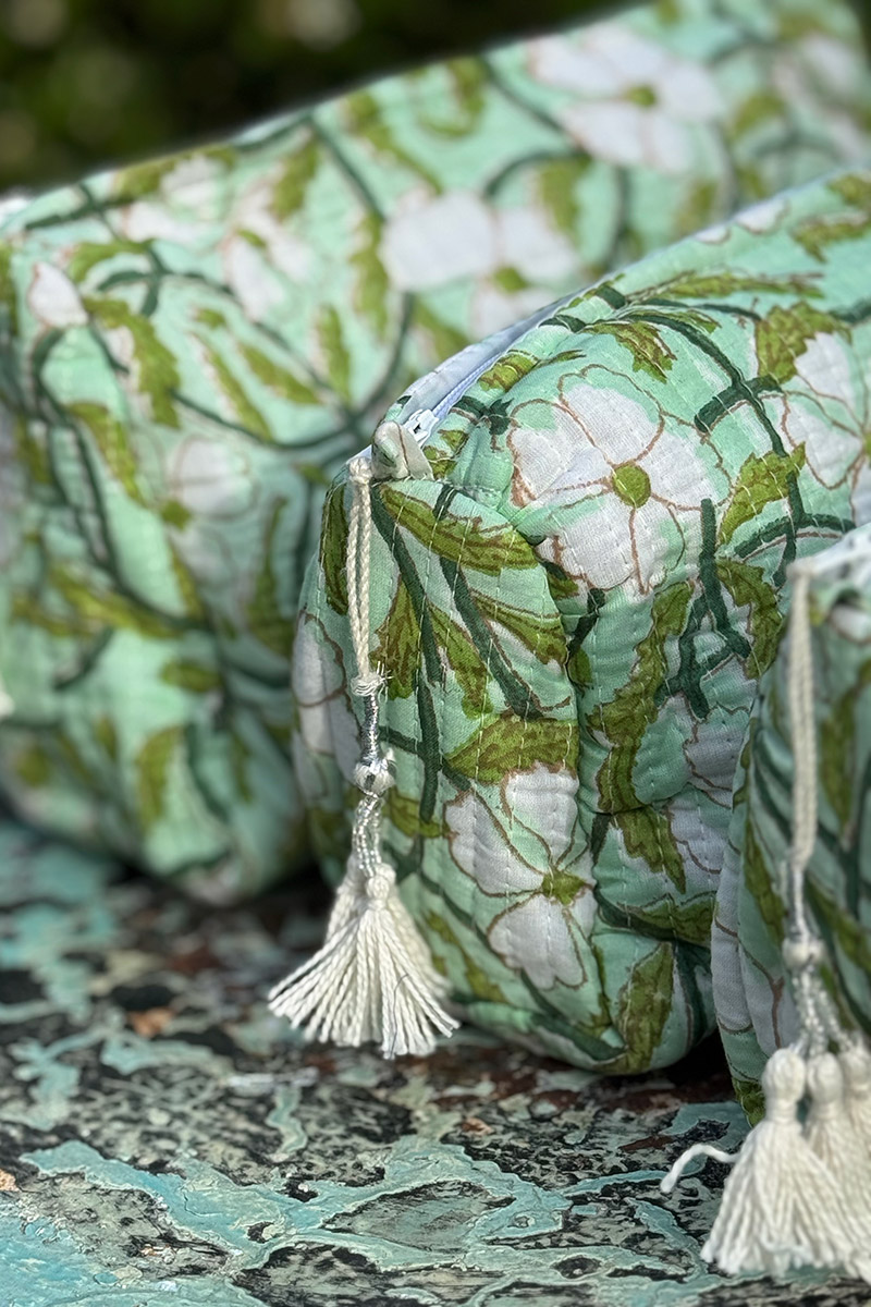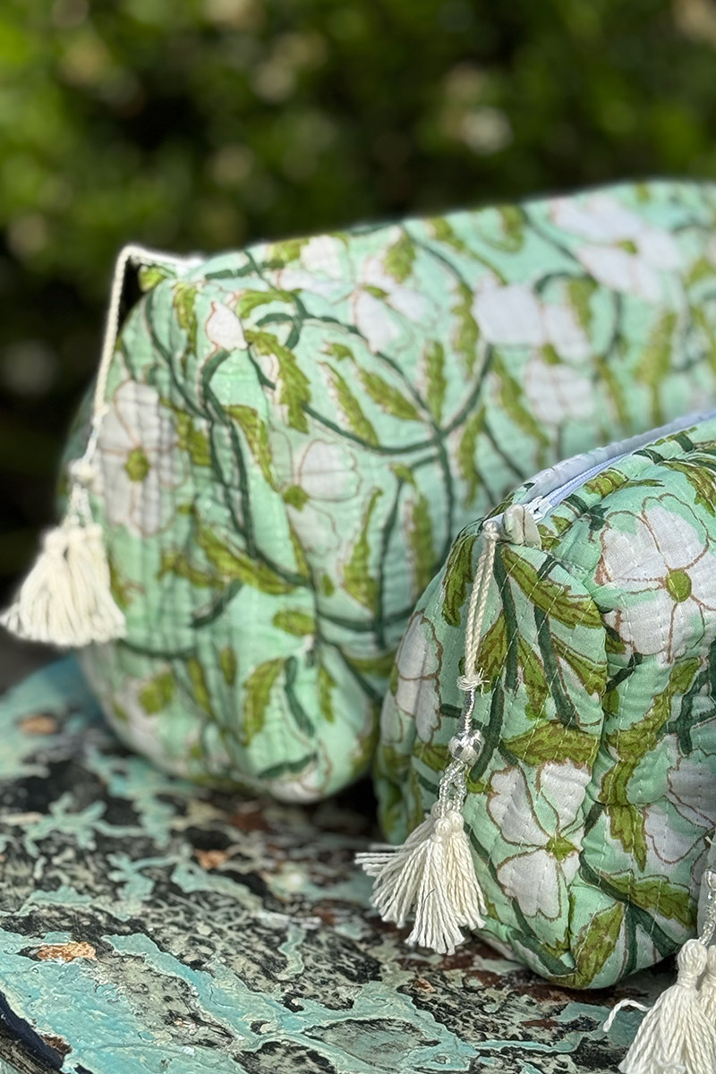 Our stunning Hand Block Printed Wash bags are made from 100% Cotton (outer), have a plastic inner lining with pockets, and are available in three sizes. Small | Medium | Large.