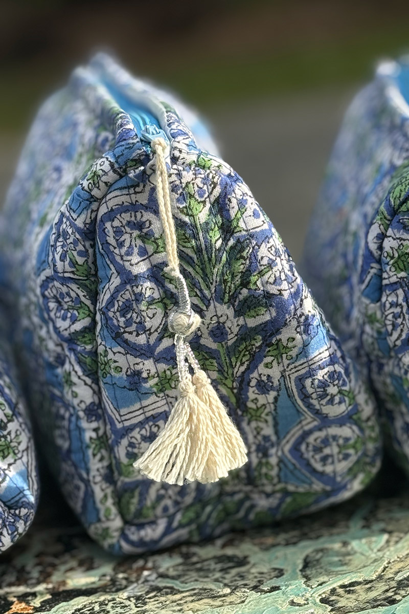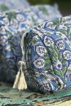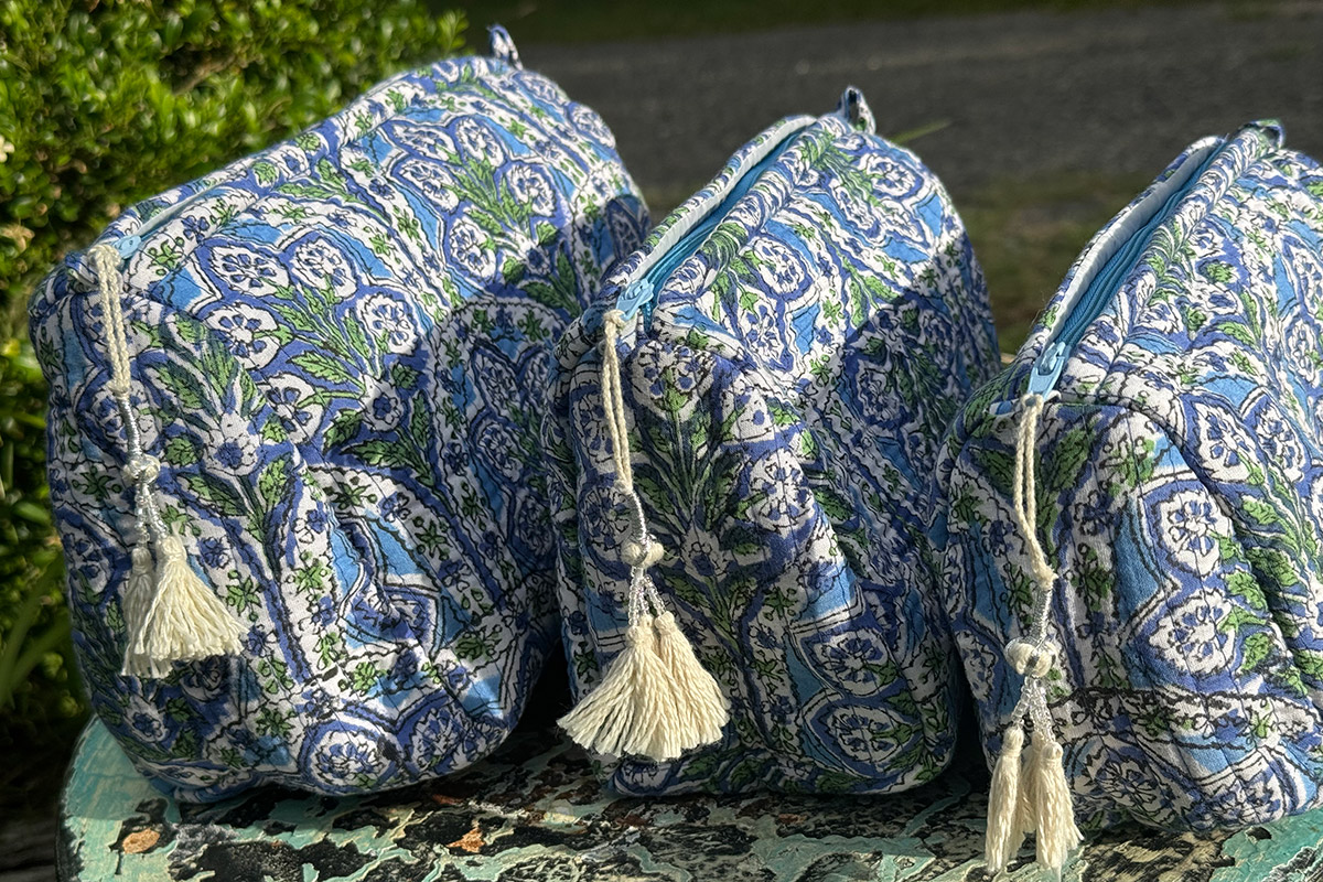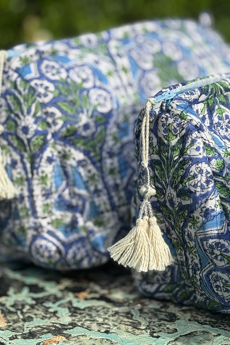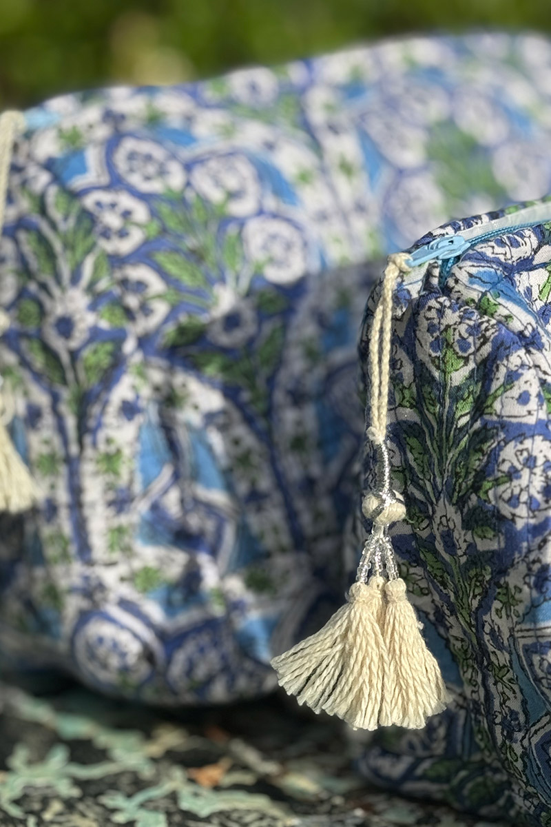 Our stunning Hand Block Printed Wash bags are made from 100% Cotton (outer), have a plastic inner lining with pockets, and are available in three sizes. Small | Medium | Large.