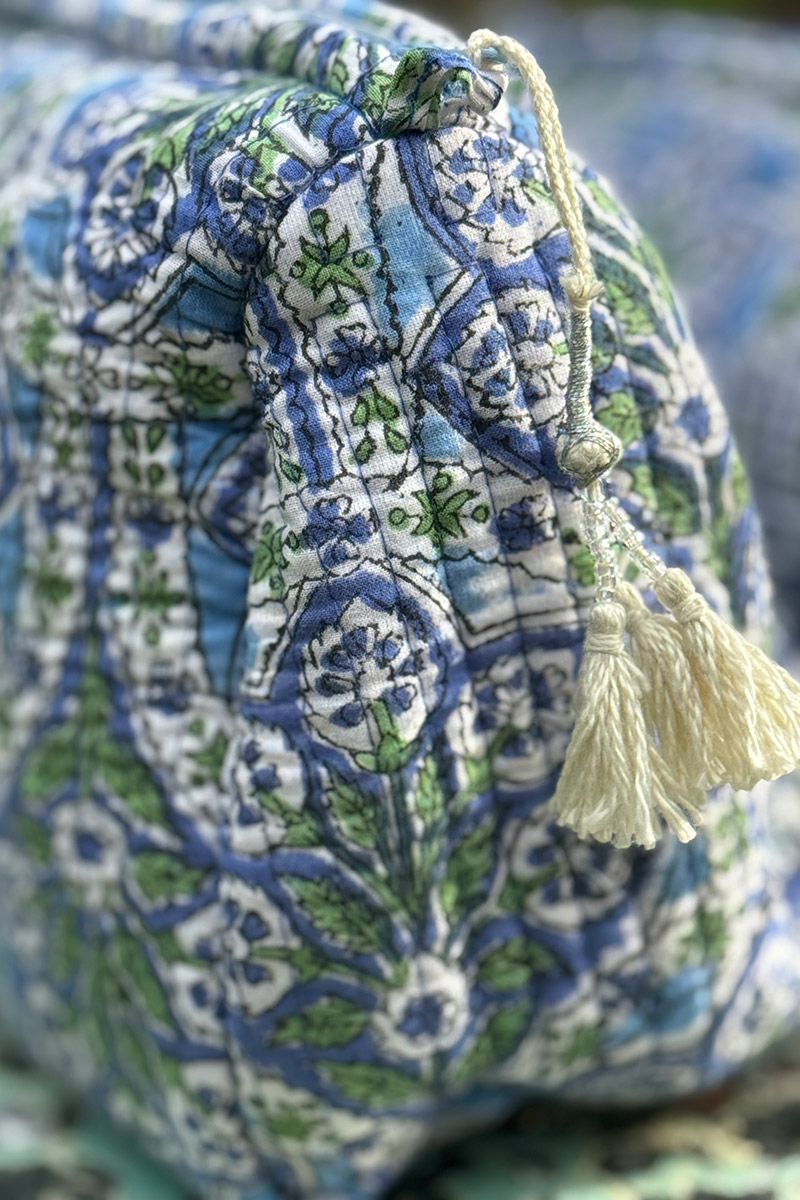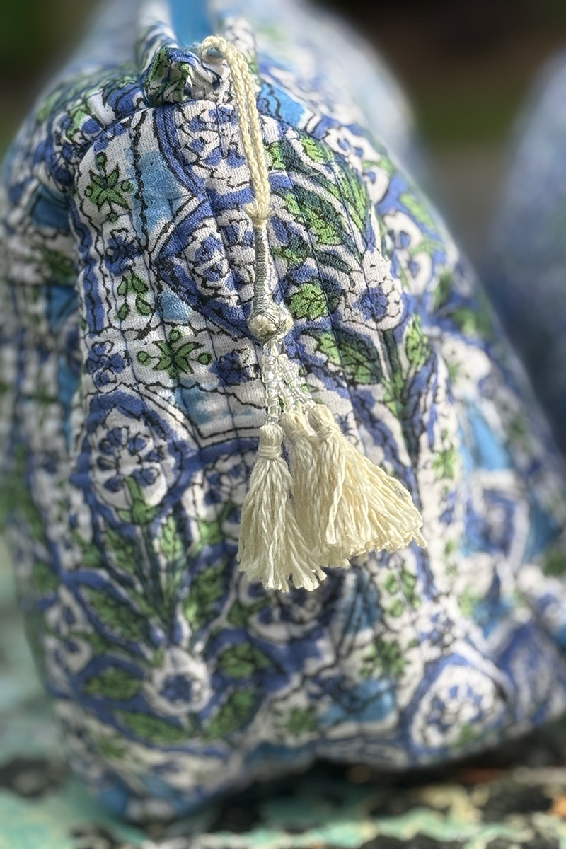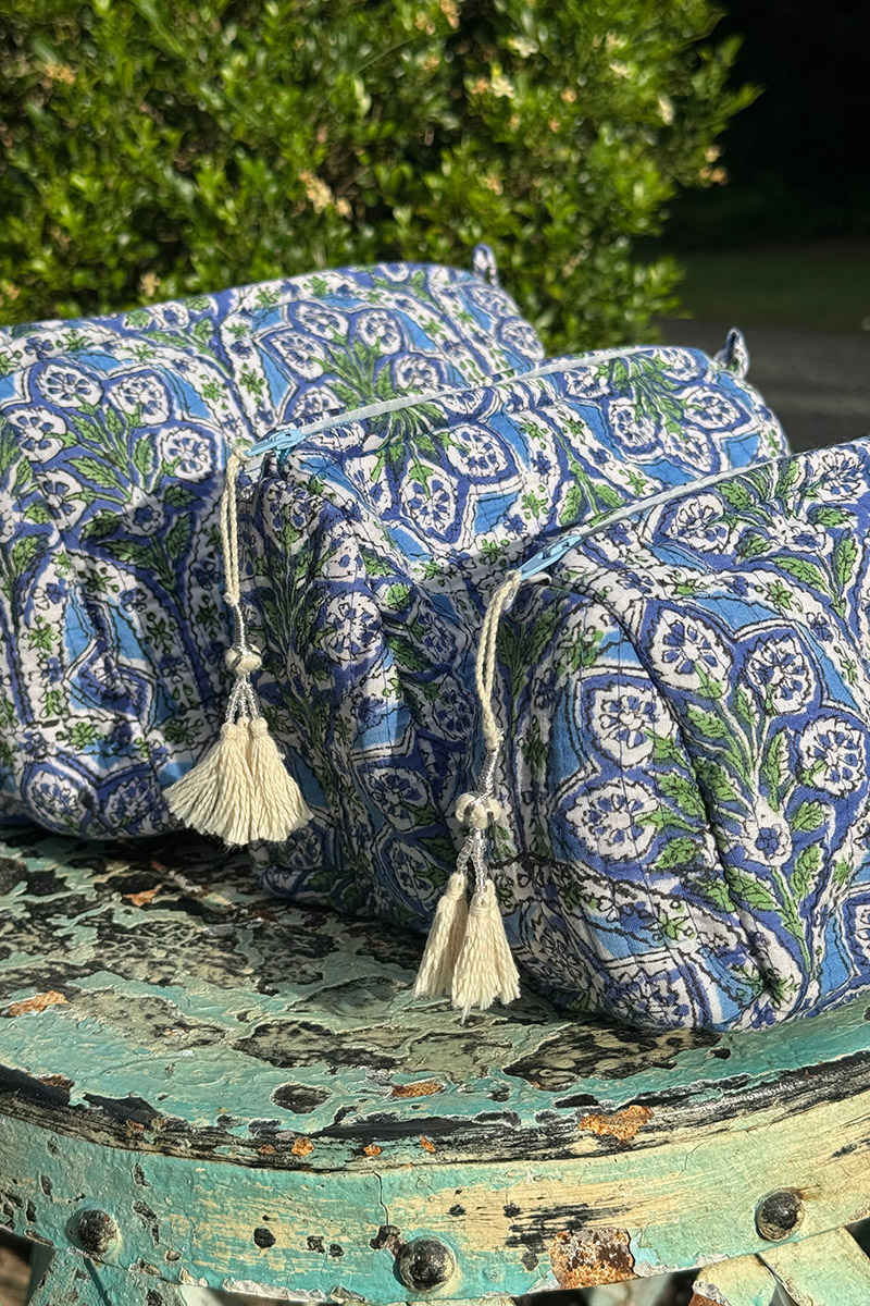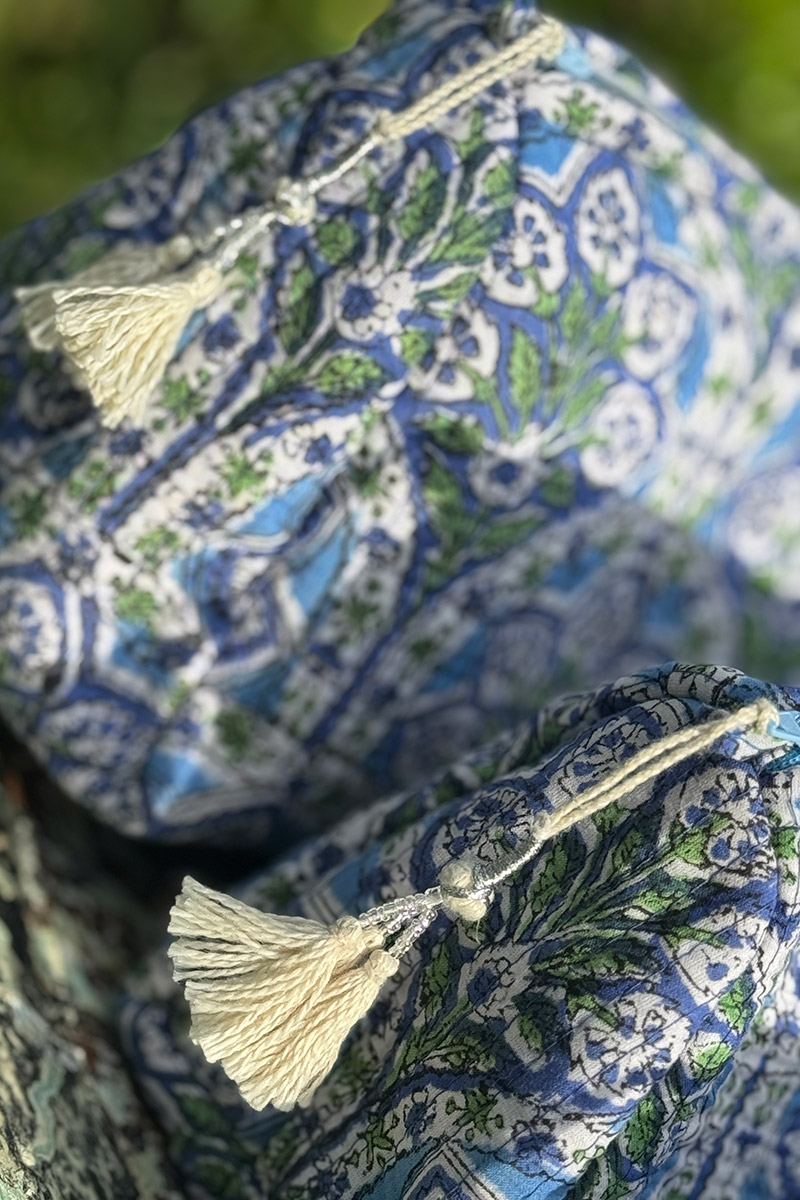 Our stunning Hand Block Printed Wash bags are made from 100% Cotton (outer), have a plastic inner lining with pockets, and are available in three sizes. Small | Medium | Large.